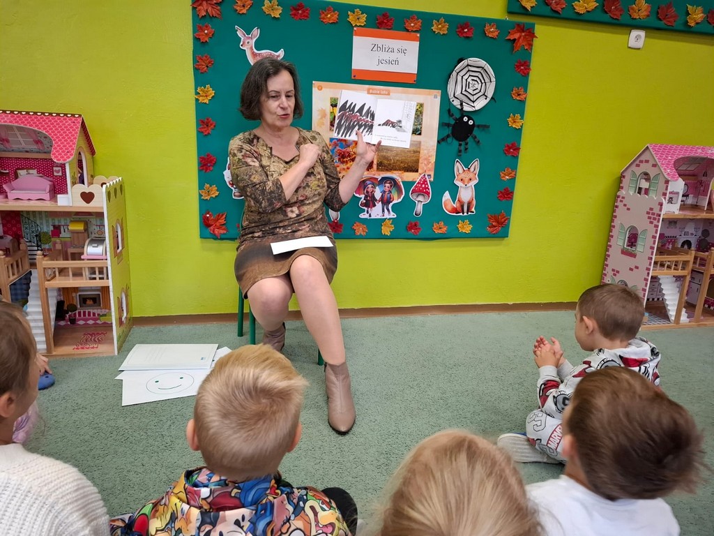 W ramach tej akcji przedszkolaków odwiedziła Pani Danuta Wrona - nauczycielka języka polskiego, bibliotekarka, która jak zwykle przygotowała wiele ciekawych niespodzianek. Dzieciaki w skupieniu i zaciekawieniu wysłuchały książki M. Bryczyńskiego, L. Głazewskiej-Dańko pt. „Jedna chwilka uczuć kilka czyli z uczuciem o uczuciach”, która pozwoliła najmłodszym utrwalić wiedzę związaną z nazywaniem i rozpoznawaniem emocji.