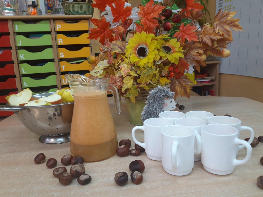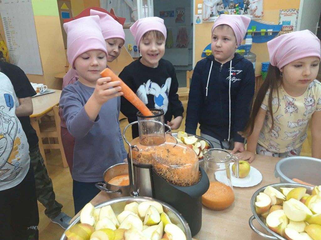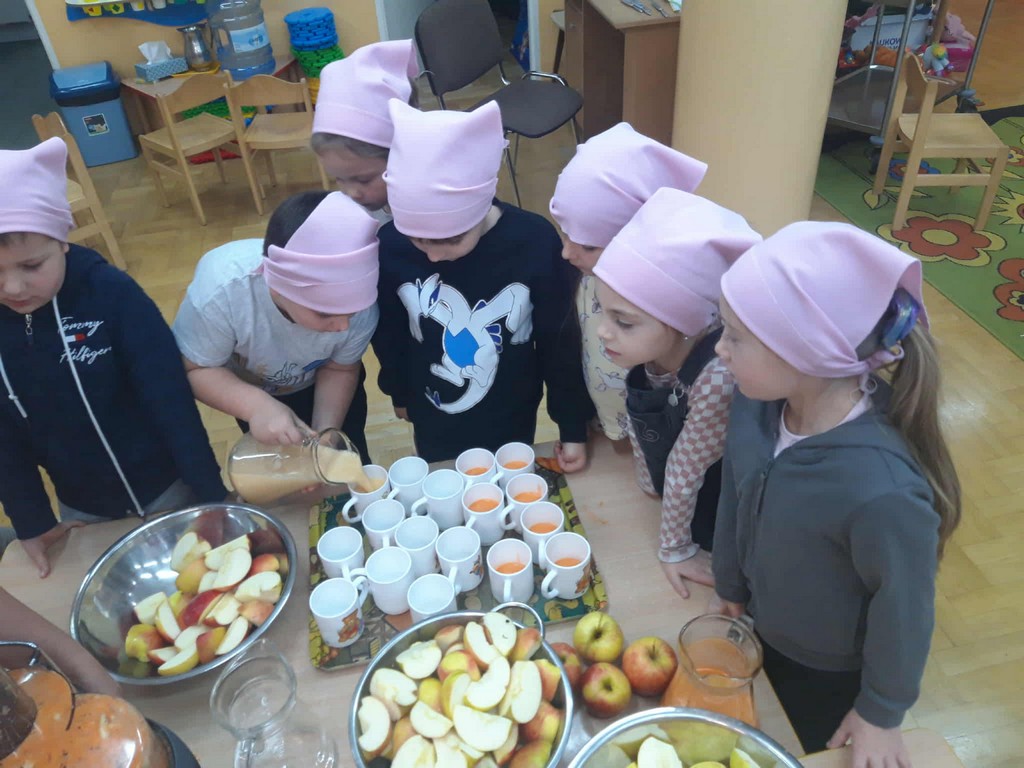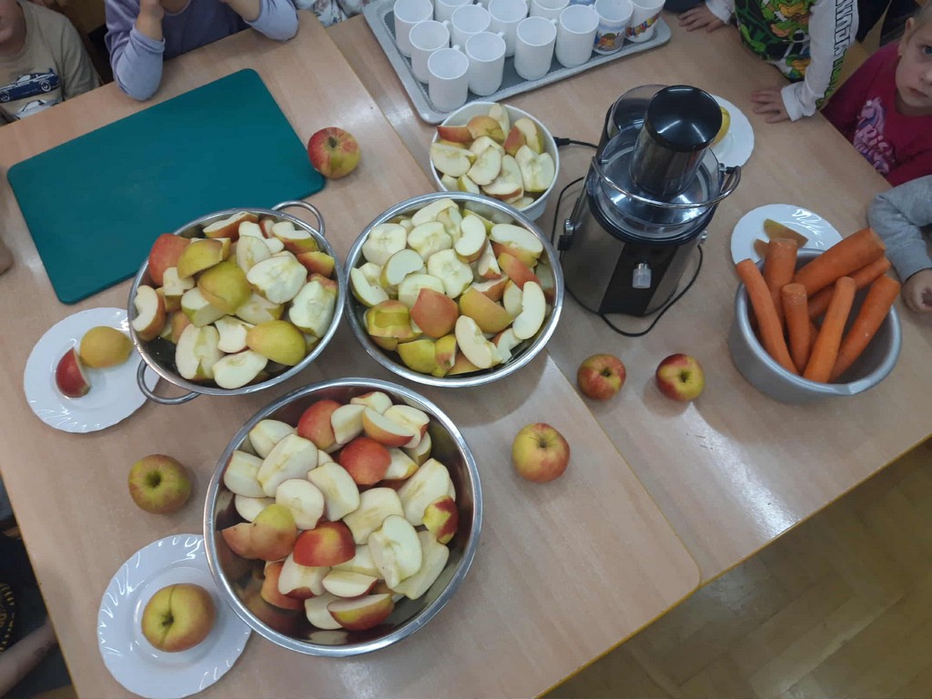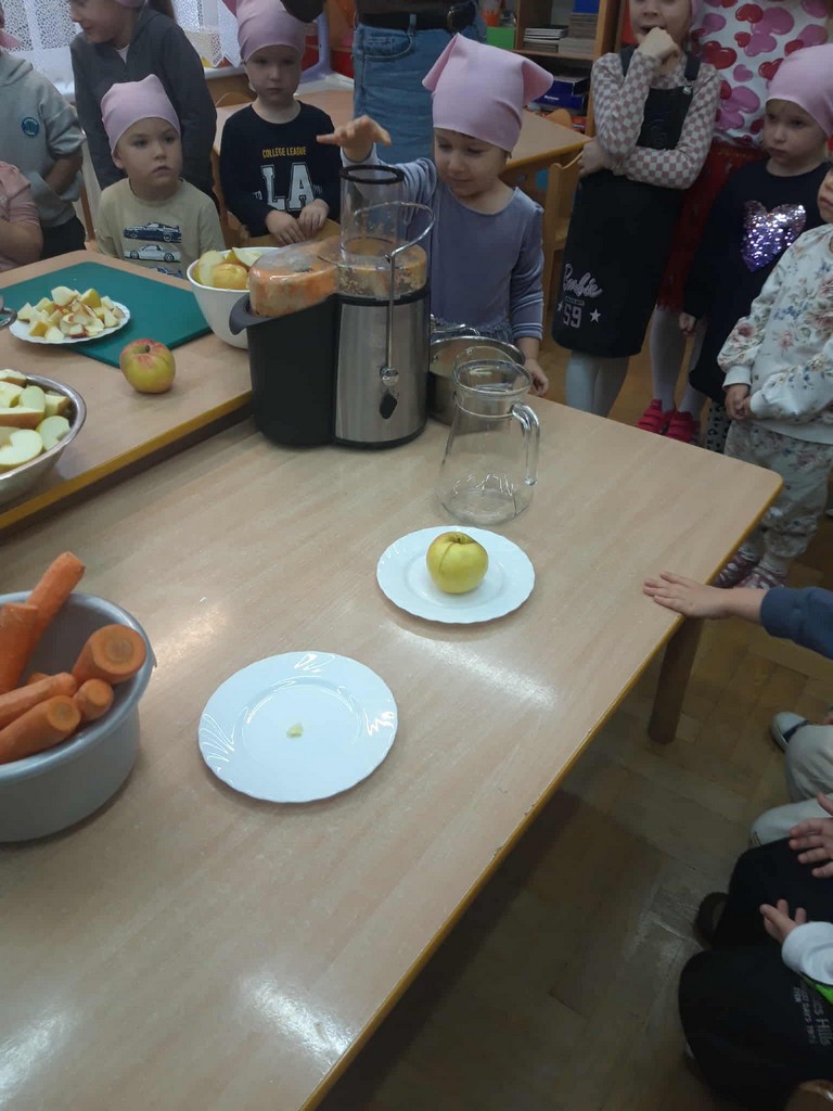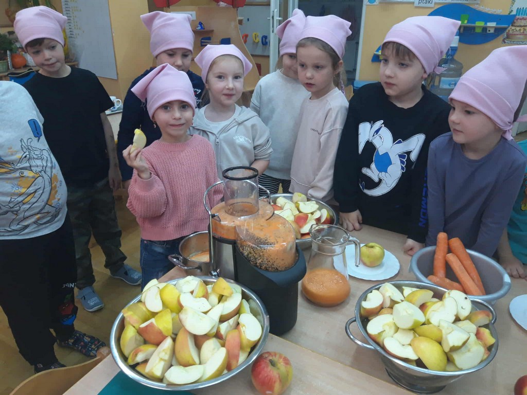 I („Misiaczki”) i III („Tygryski”) przygotowały wspólnie pyszny i zdrowy sok jabłkowo-marchewkowy. Wszyscy dobrze wiemy, że soki to doskonałe źródło witamin i cennych składników.