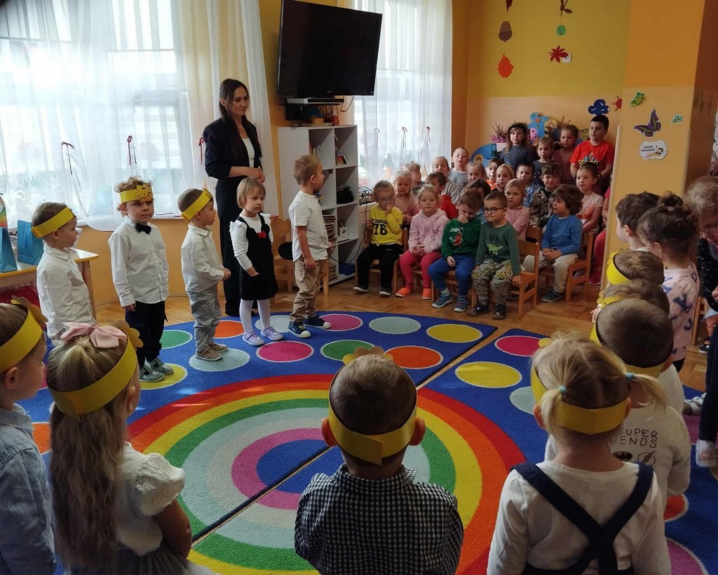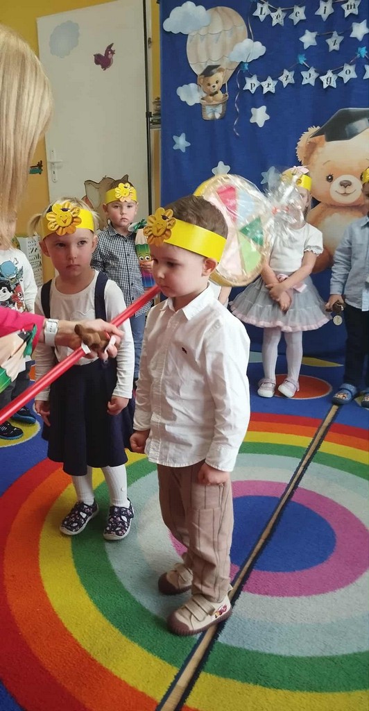Zgodnie z naszą przedszkolną tradycją, symbolicznym "narzędziem" pasowania był kolorowy lizak, który na chwilę zamienił się w magiczną różdżkę. Pani Kierownik, dotykając ramienia każdego malucha tym niezwykłym lizakiem, wypowiadała magiczną formułę: "Pasuję Cię na dzielnego, wesołego i uśmiechniętego przedszkolaka!". Emocje były ogromne, a w oczach dzieci widać było dumę i radość.