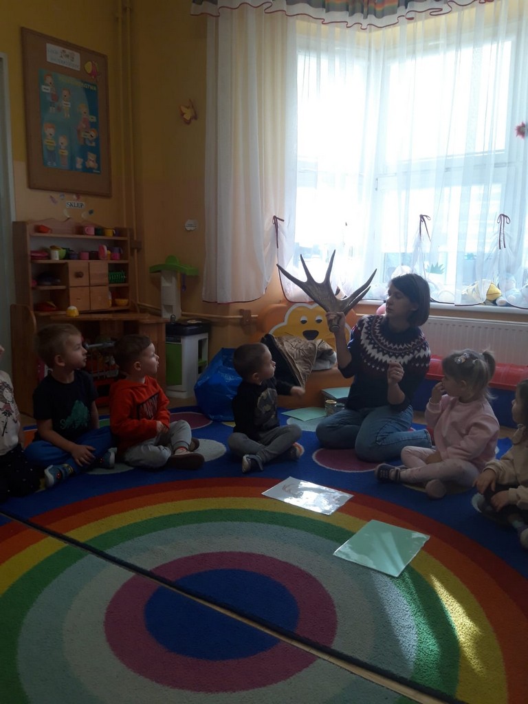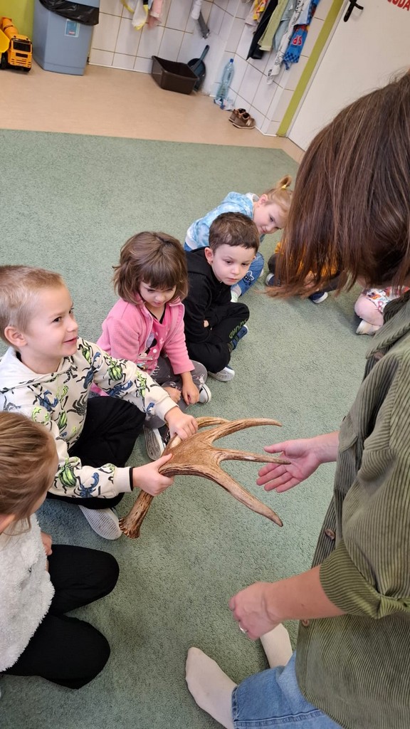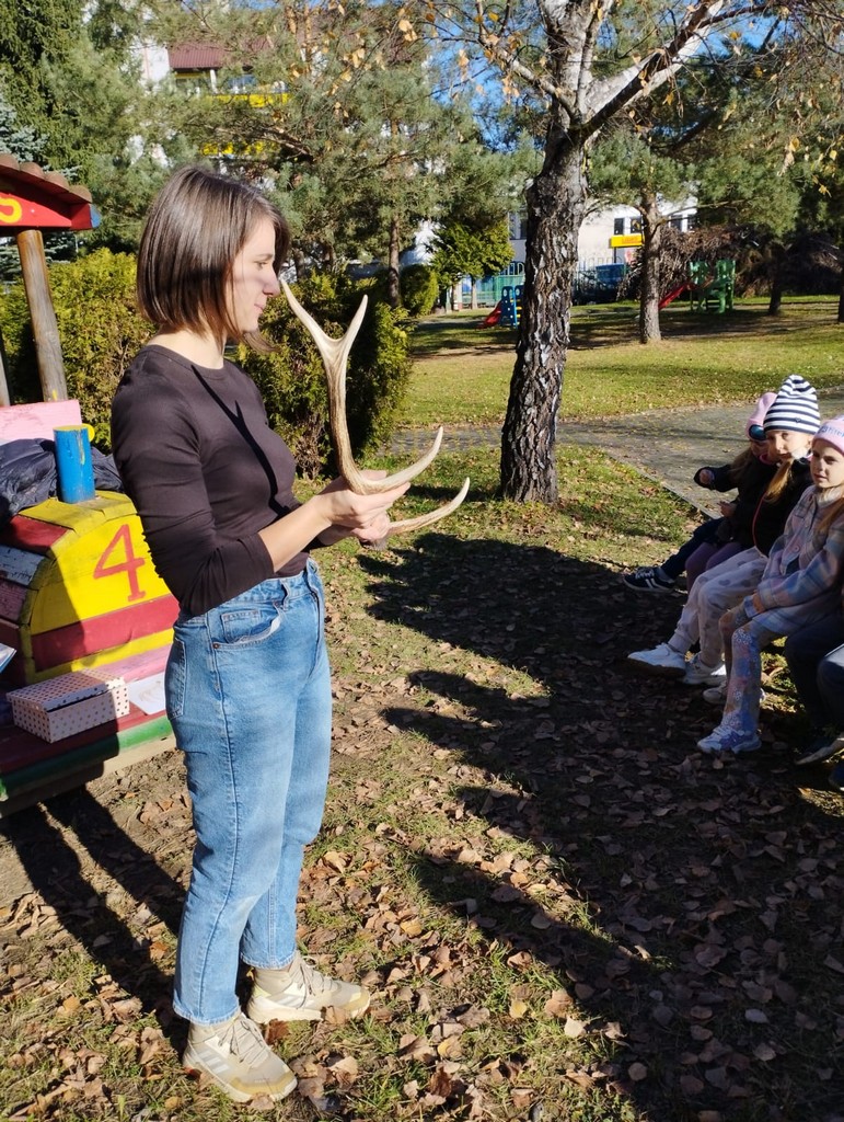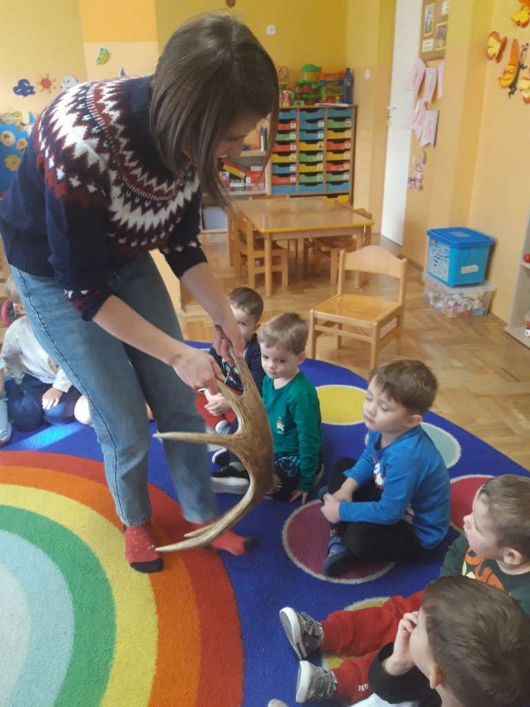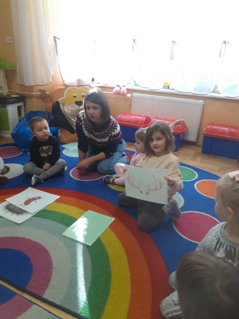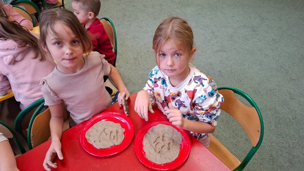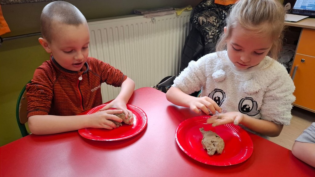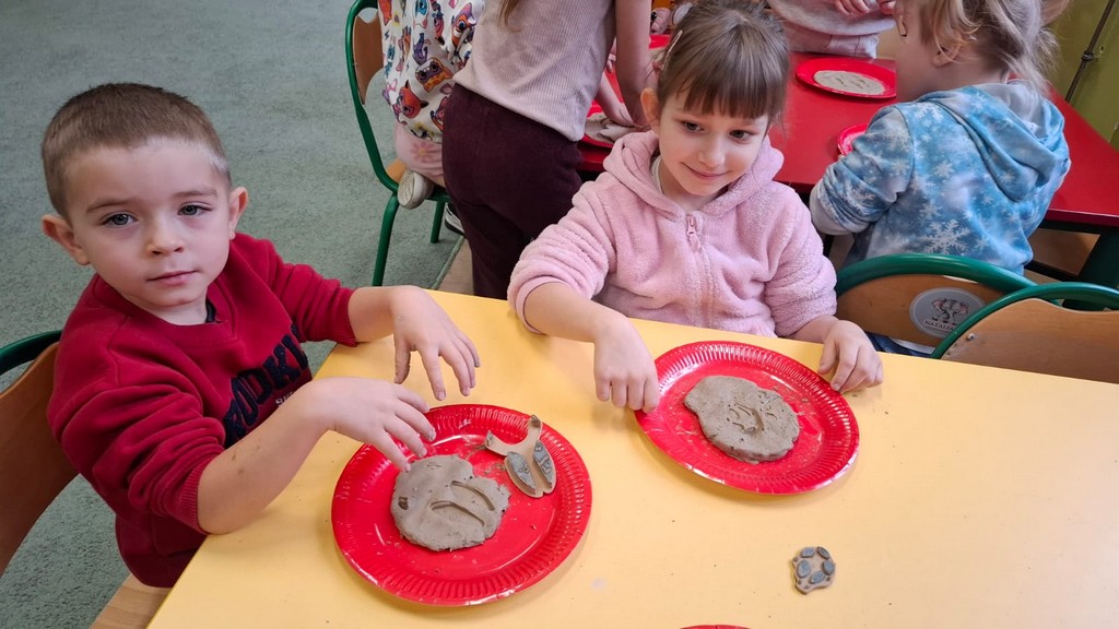 Przedszkolaki oglądały pióra i gniazda ptaków, dotykały poroży jeleni i koziołków, słuchały odgłosów zwierząt i ptaków żyjących w lasach i parkach; poznawały również tropy wybranych zwierząt leśnych. Dużą radość sprawiła dzieciom część warsztatowa podczas której każde dziecko wykonało w glinie odcisk śladu wybranego zwierzęcia. Była to ciekawa pamiątka, którą dzieci zabrały ze sobą do domu. Dziękujemy Fundacji „Dziki Projekt” za kolejne ciekawe i inspirujące zajęcia i już nie możemy doczekać się kolejnych.