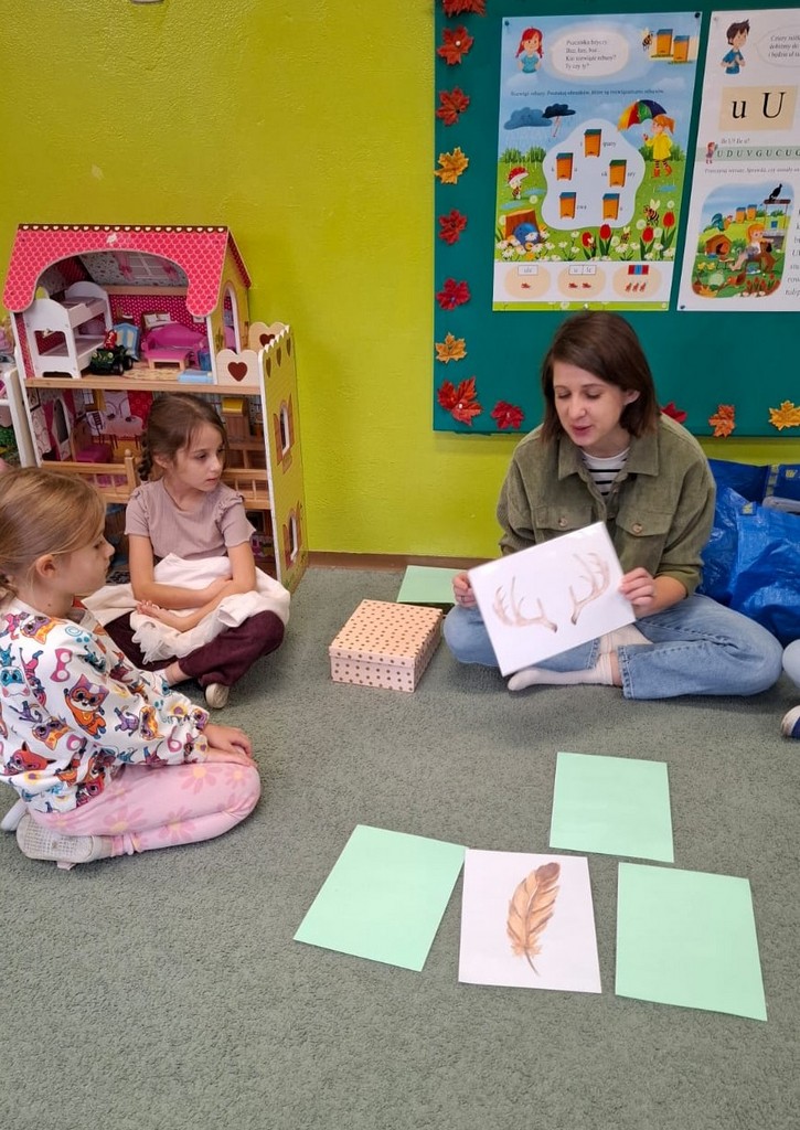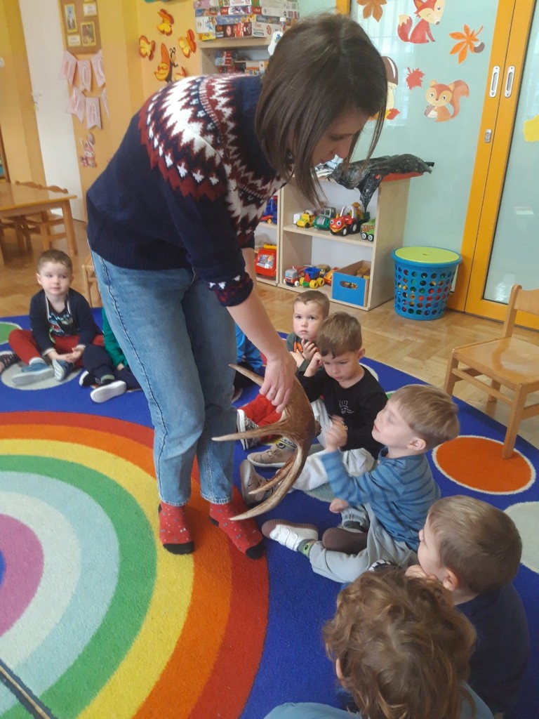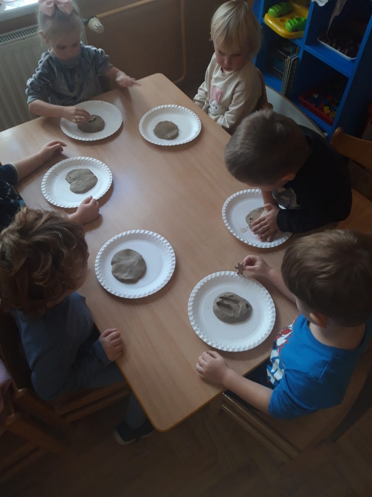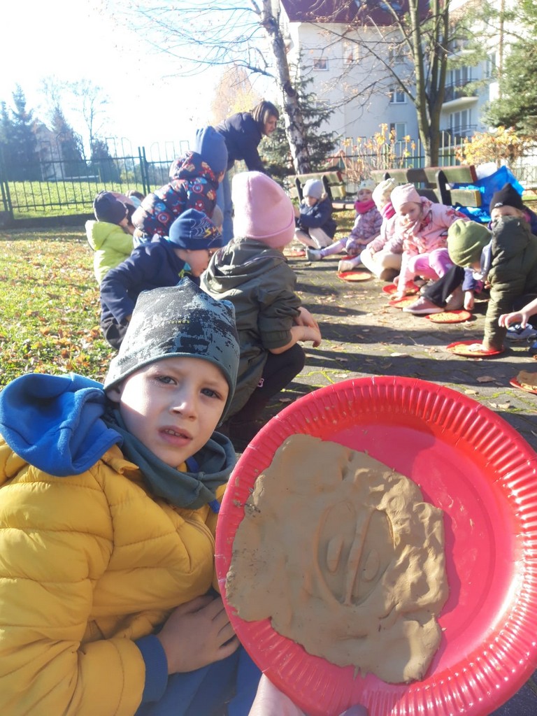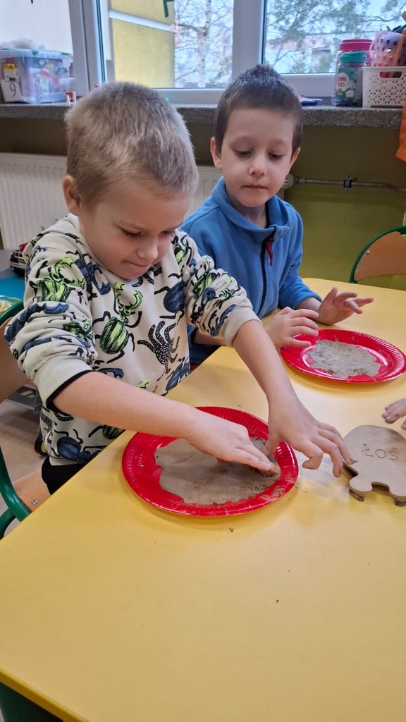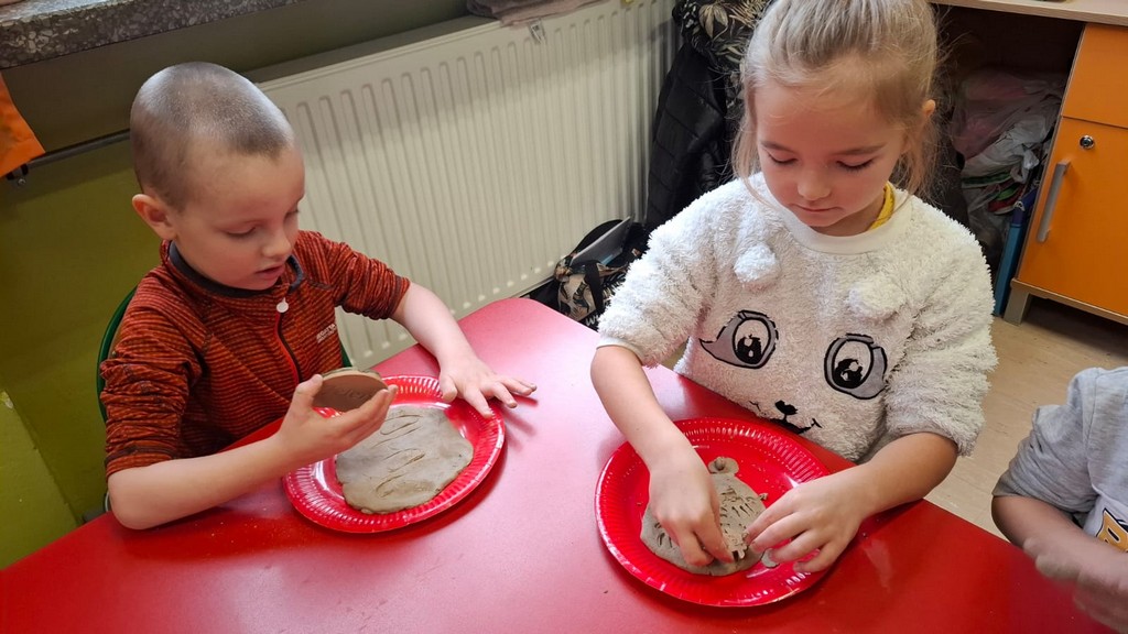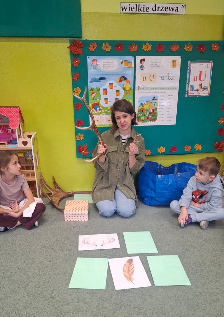 Przedszkolaki oglądały pióra i gniazda ptaków, dotykały poroży jeleni i koziołków, słuchały odgłosów zwierząt i ptaków żyjących w lasach i parkach; poznawały również tropy wybranych zwierząt leśnych. Dużą radość sprawiła dzieciom część warsztatowa podczas której każde dziecko wykonało w glinie odcisk śladu wybranego zwierzęcia. Była to ciekawa pamiątka, którą dzieci zabrały ze sobą do domu. Dziękujemy Fundacji „Dziki Projekt” za kolejne ciekawe i inspirujące zajęcia i już nie możemy doczekać się kolejnych.
