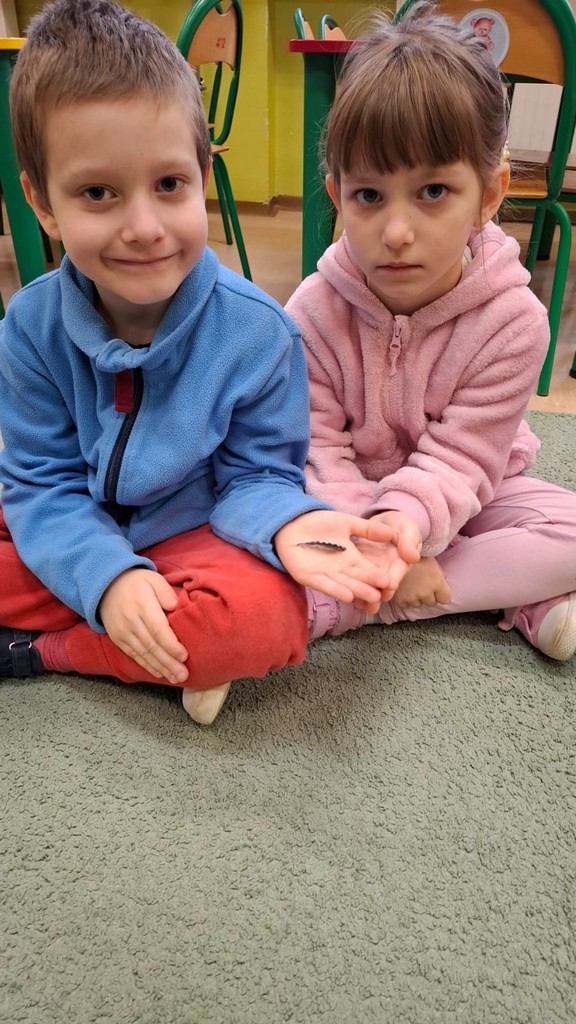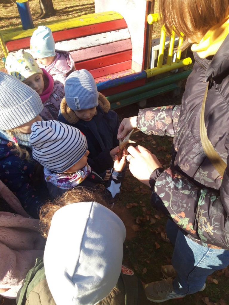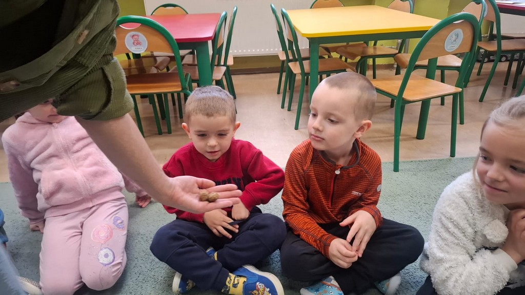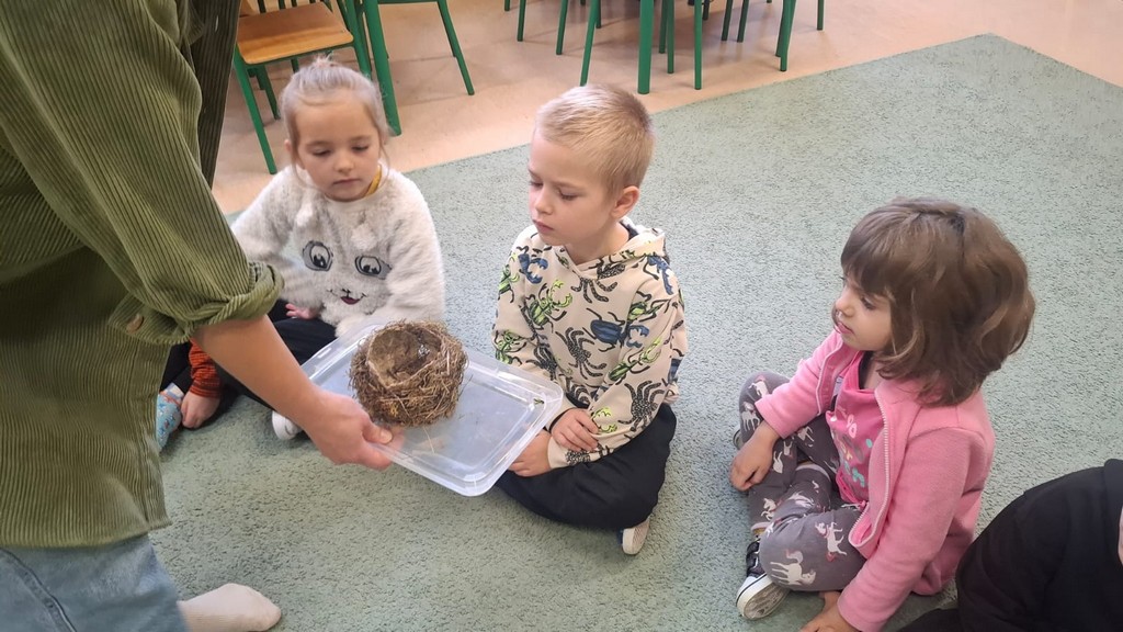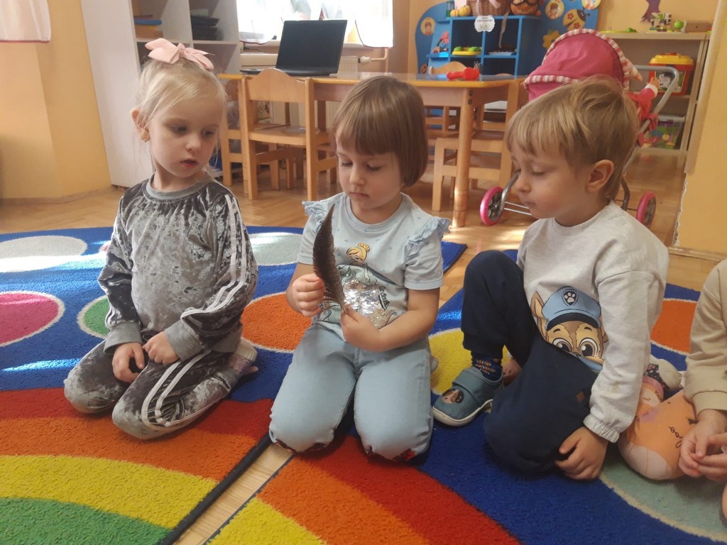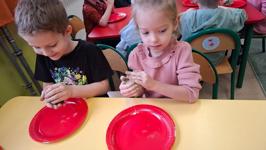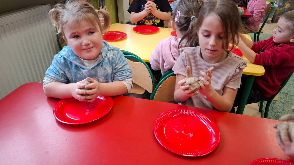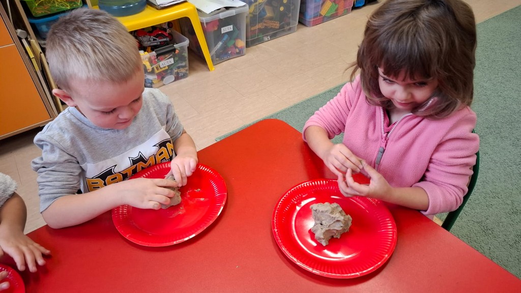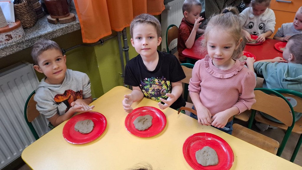 Przedszkolaki oglądały pióra i gniazda ptaków, dotykały poroży jeleni i koziołków, słuchały odgłosów zwierząt i ptaków żyjących w lasach i parkach; poznawały również tropy wybranych zwierząt leśnych. Dużą radość sprawiła dzieciom część warsztatowa podczas której każde dziecko wykonało w glinie odcisk śladu wybranego zwierzęcia. Była to ciekawa pamiątka, którą dzieci zabrały ze sobą do domu. Dziękujemy Fundacji „Dziki Projekt” za kolejne ciekawe i inspirujące zajęcia i już nie możemy doczekać się kolejnych.