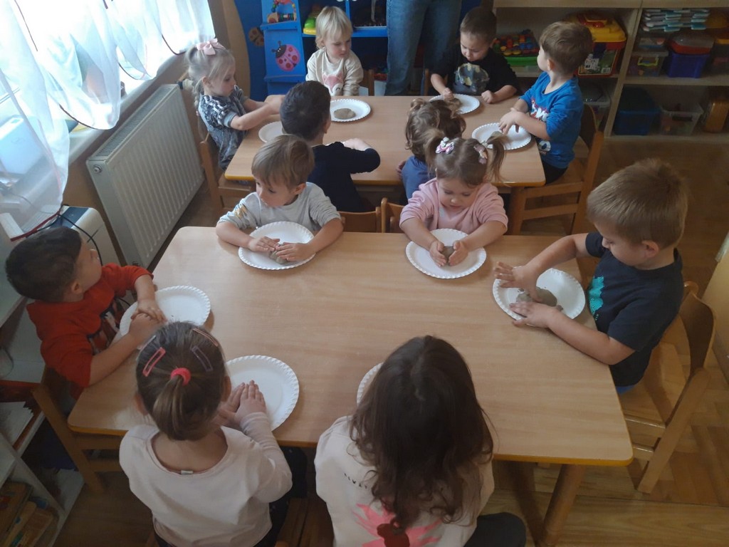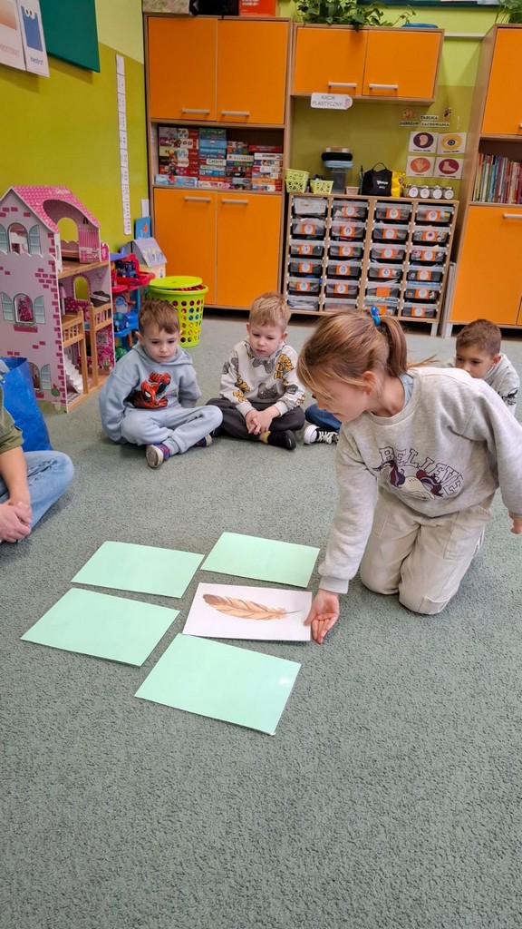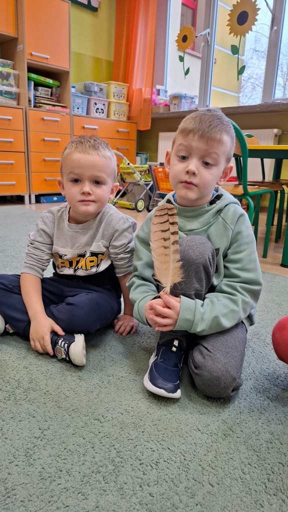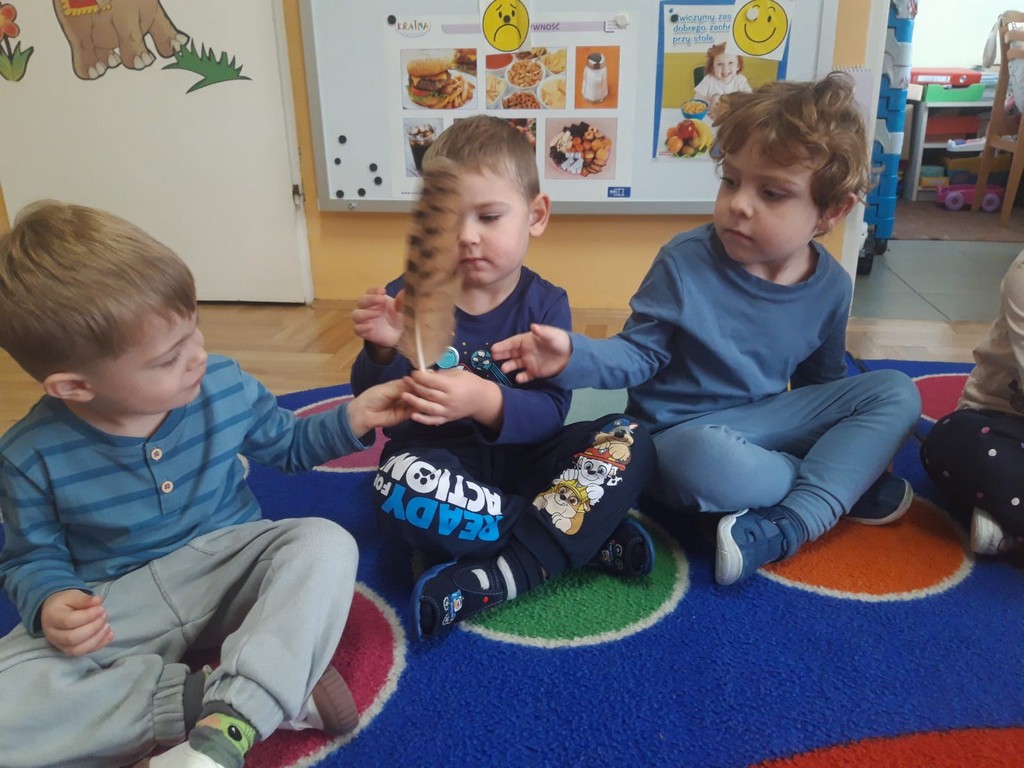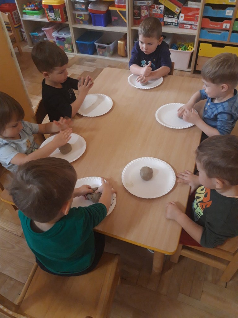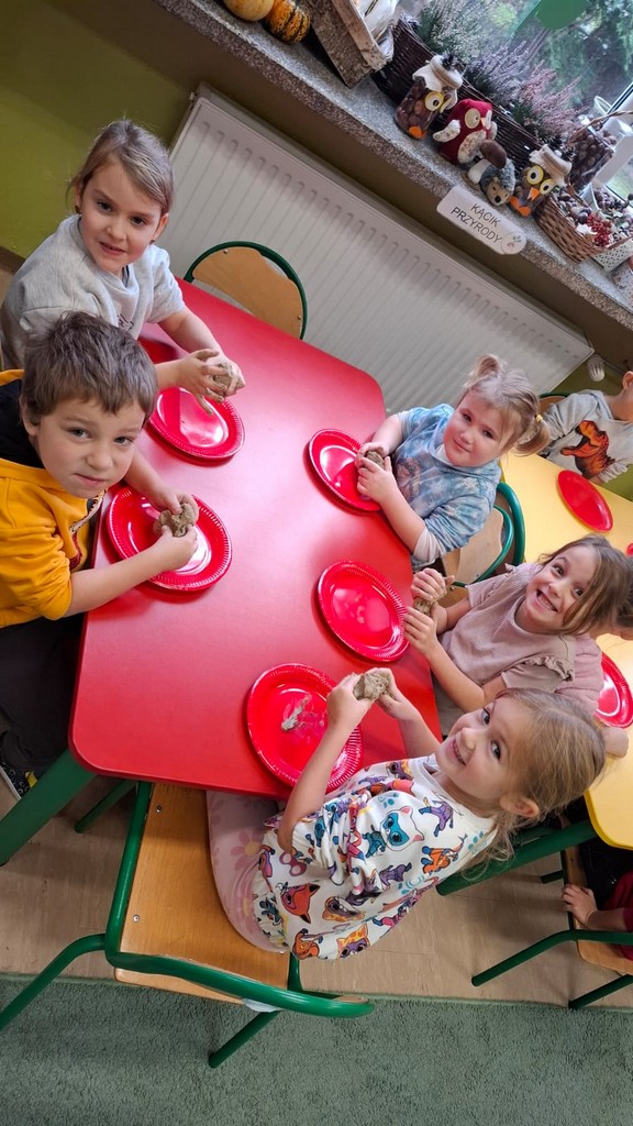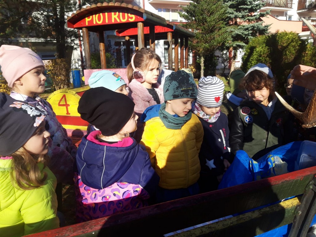 Przedszkolaki oglądały pióra i gniazda ptaków, dotykały poroży jeleni i koziołków, słuchały odgłosów zwierząt i ptaków żyjących w lasach i parkach; poznawały również tropy wybranych zwierząt leśnych. Dużą radość sprawiła dzieciom część warsztatowa podczas której każde dziecko wykonało w glinie odcisk śladu wybranego zwierzęcia. Była to ciekawa pamiątka, którą dzieci zabrały ze sobą do domu. Dziękujemy Fundacji „Dziki Projekt” za kolejne ciekawe i inspirujące zajęcia i już nie możemy doczekać się kolejnych.