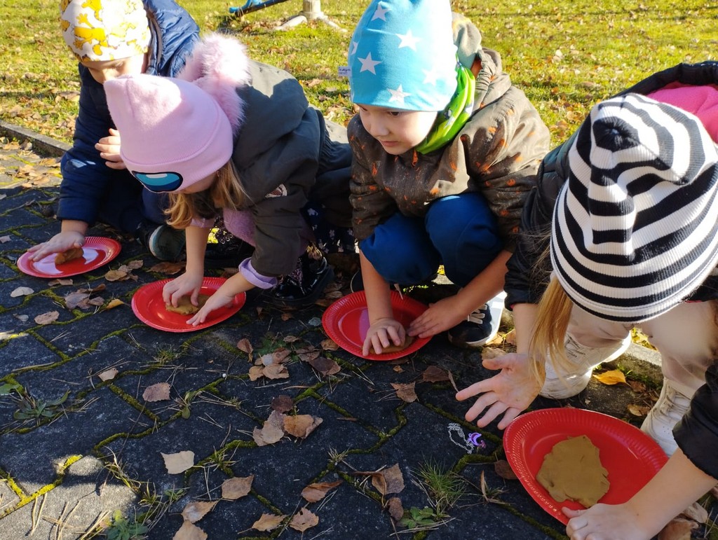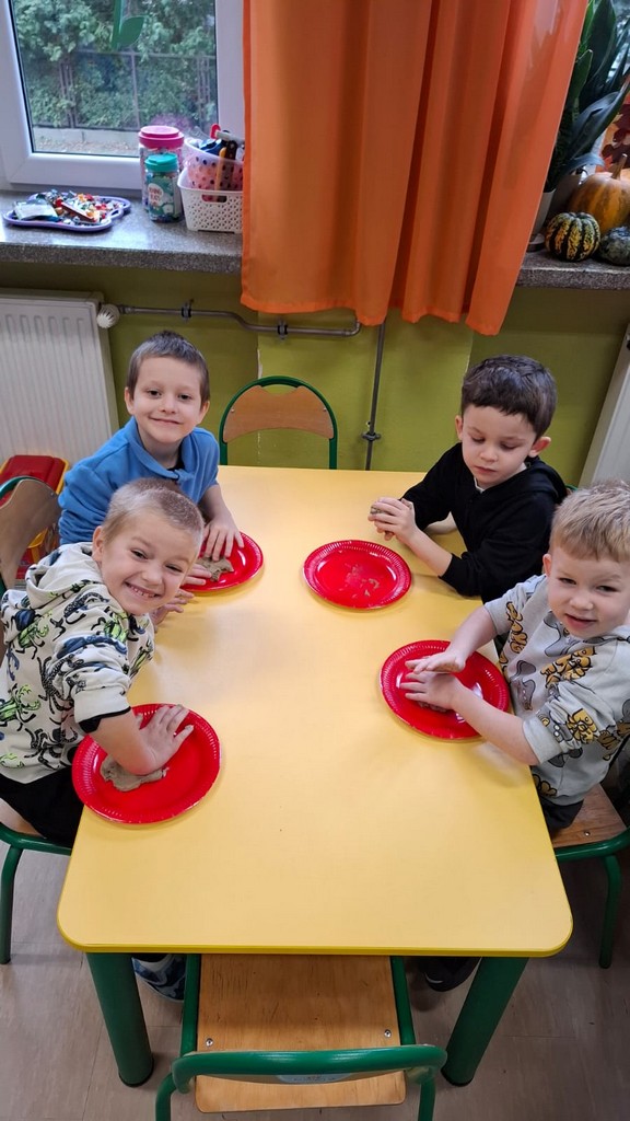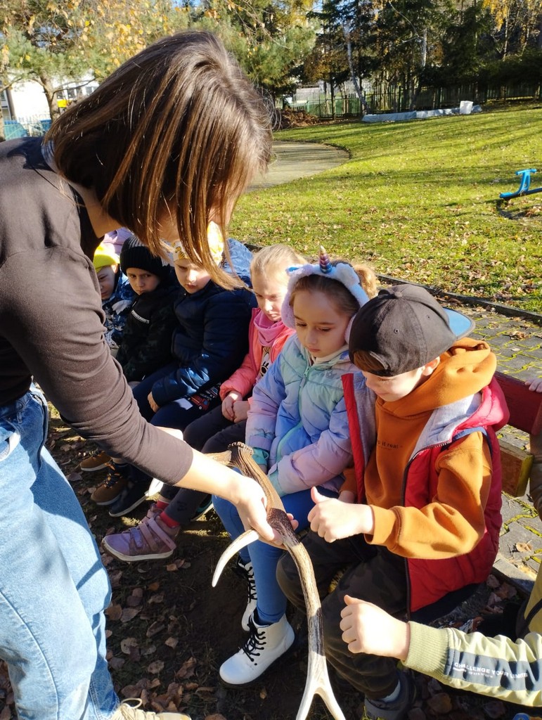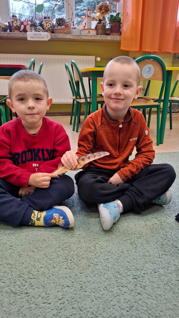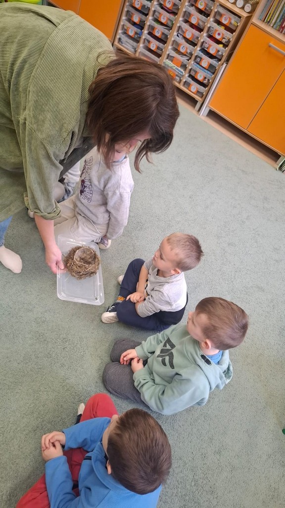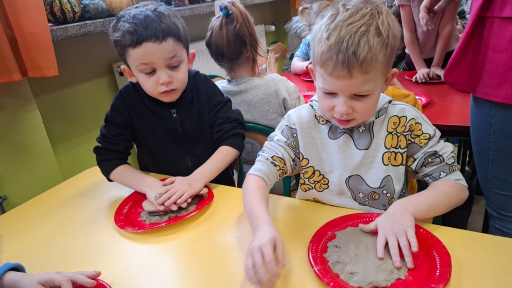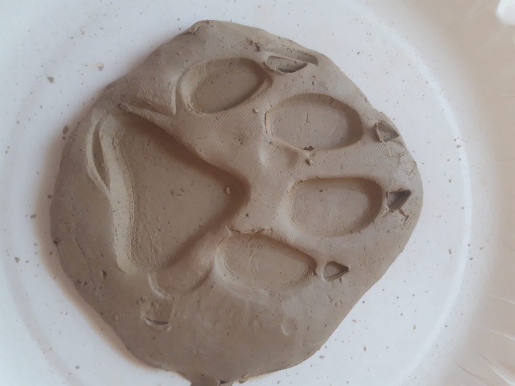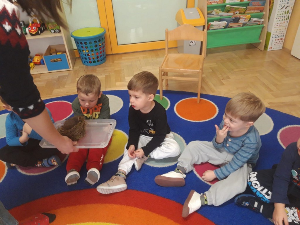 Przedszkolaki oglądały pióra i gniazda ptaków, dotykały poroży jeleni i koziołków, słuchały odgłosów zwierząt i ptaków żyjących w lasach i parkach; poznawały również tropy wybranych zwierząt leśnych. Dużą radość sprawiła dzieciom część warsztatowa podczas której każde dziecko wykonało w glinie odcisk śladu wybranego zwierzęcia. Była to ciekawa pamiątka, którą dzieci zabrały ze sobą do domu. Dziękujemy Fundacji „Dziki Projekt” za kolejne ciekawe i inspirujące zajęcia i już nie możemy doczekać się kolejnych.