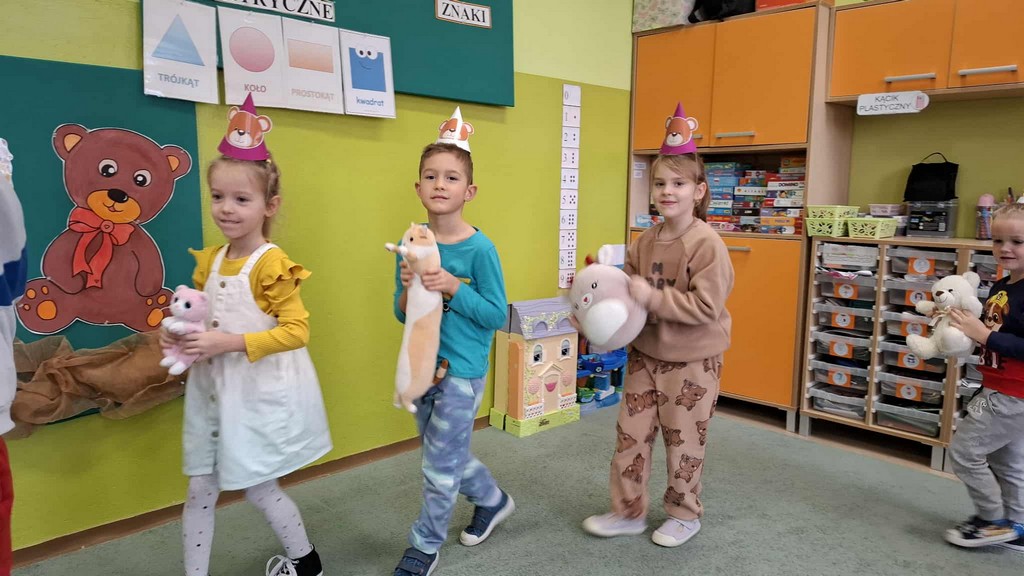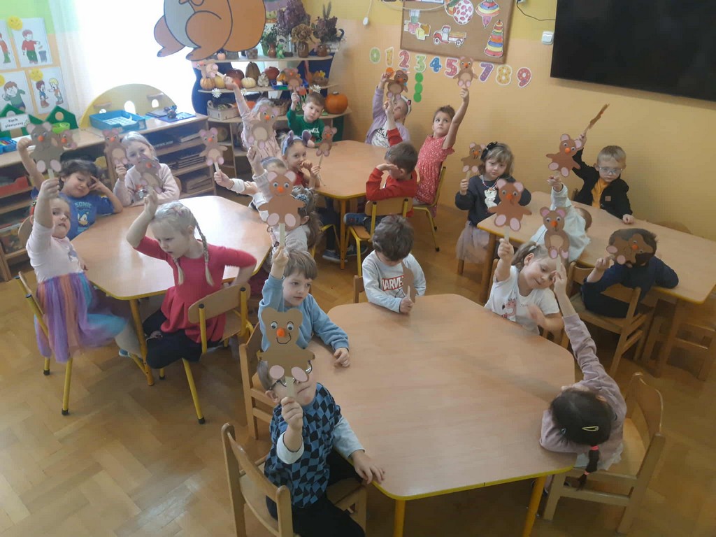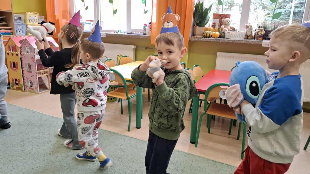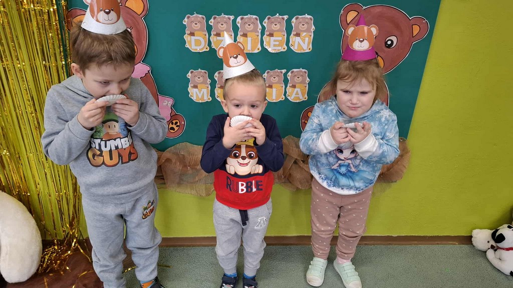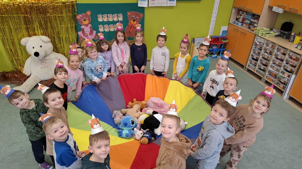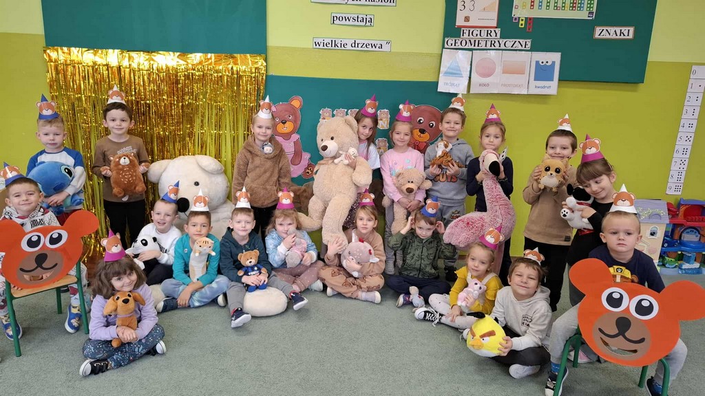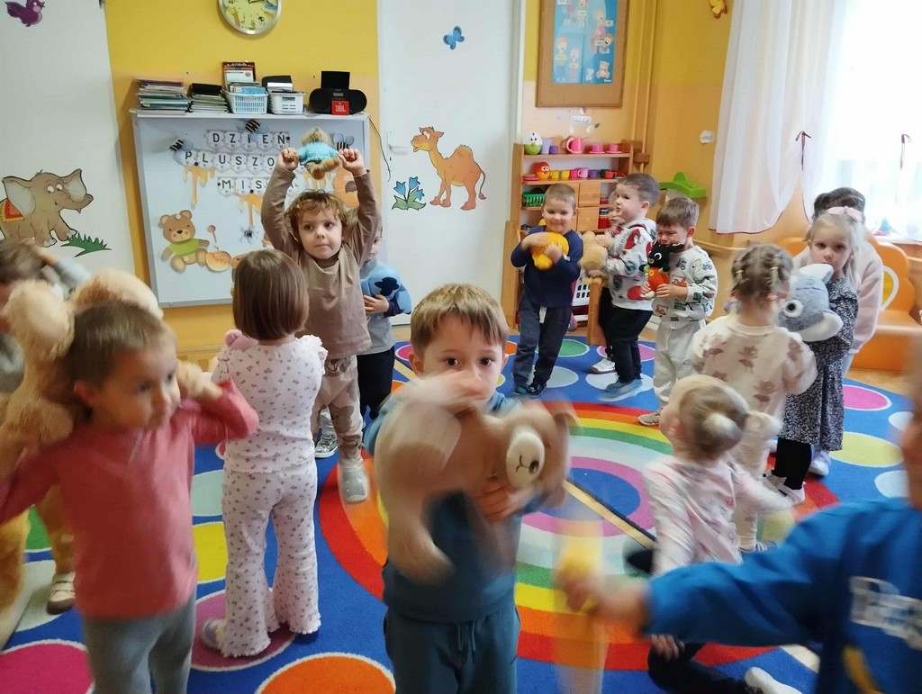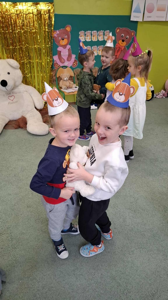 25 listopada tradycyjnie obchodziliśmy „Dzień Pluszowego Misia”. Dzieci przyniosły do przedszkola swoje ukochane pluszaki, a każdy z nich był inny i wyjątkowy. Misie towarzyszyły dzieciom podczas śpiewania piosenek, słuchania tekstów literackich, rozwiązywania zagadek, oglądania bajek. Wśród wielu atrakcji zaplanowanych na ten dzień znalazły się; konkursy, zręcznościowe tory przeszkód, zabawy ruchowe oraz taneczne przy utworach z misiami w roli głównej. Największym jednak wyzwaniem dla dzieci było samodzielne przygotowanie torcików. Biszkoptowe ciasteczka specjalnie upieczone na tę okazję, zostały udekorowane bitą śmietaną, owocami, żelkami oraz kolorową posypką. Torciki nie tylko wyglądały pięknie i kreatywnie, ale smakowały wyśmienicie. Mamy nadzieję, że misiowe przyjęcie pozostanie we wspomnieniach przedszkolaków na długi czas.