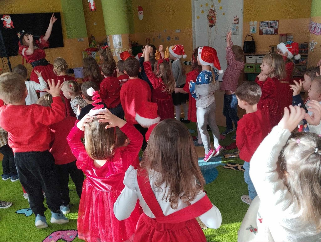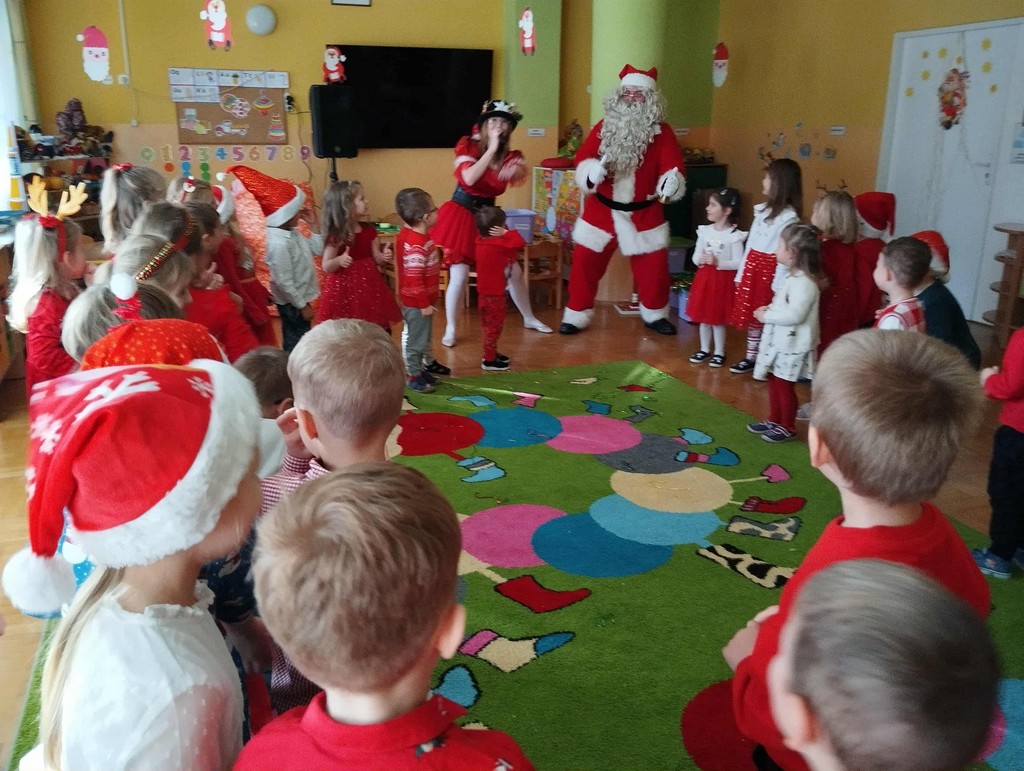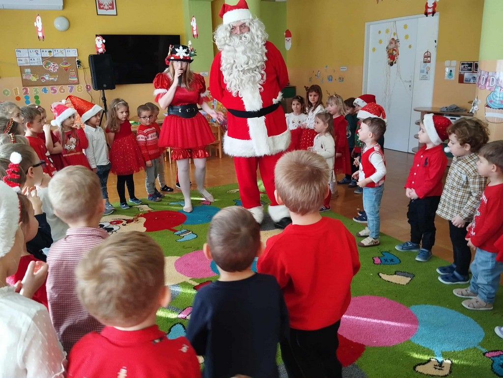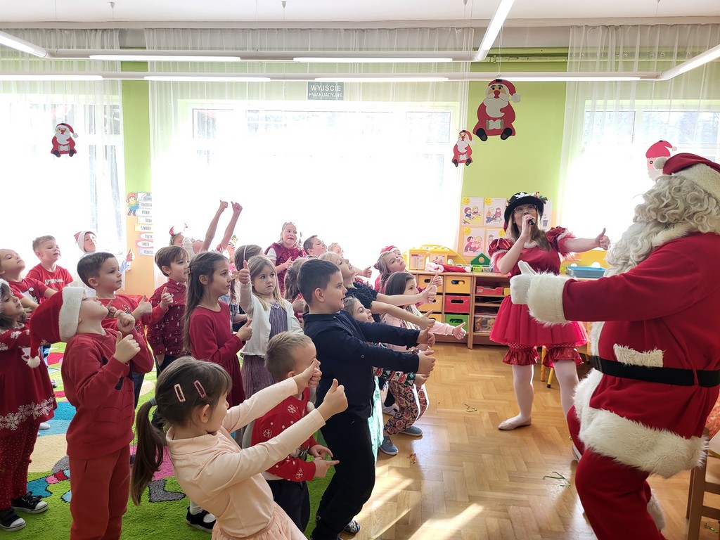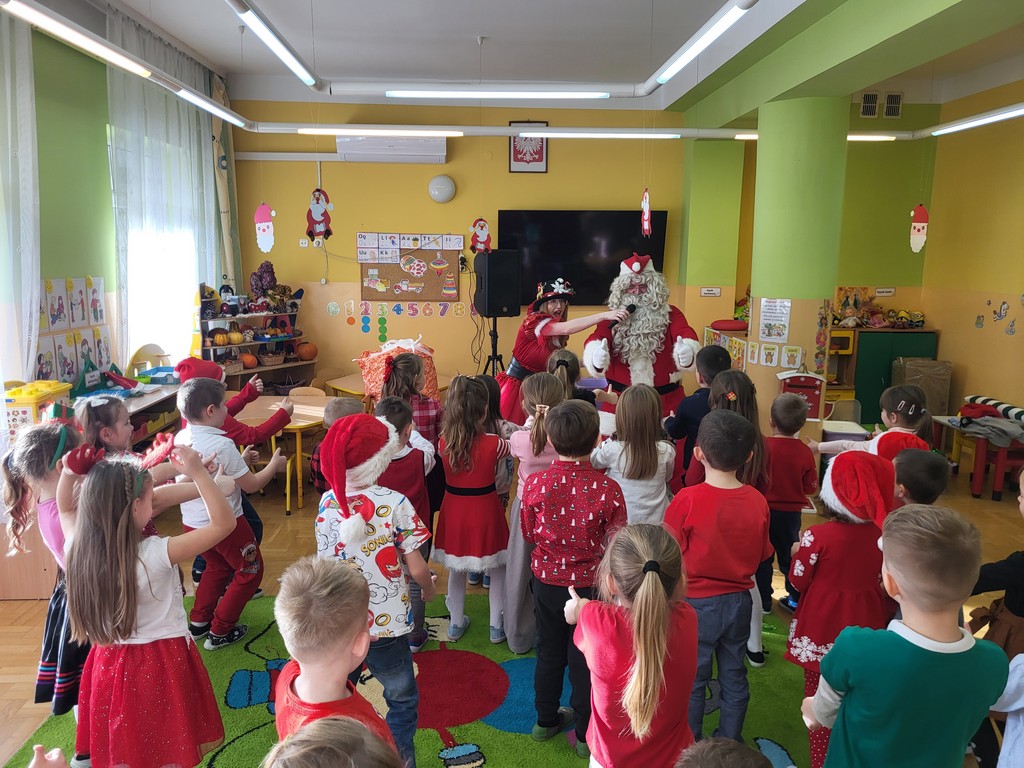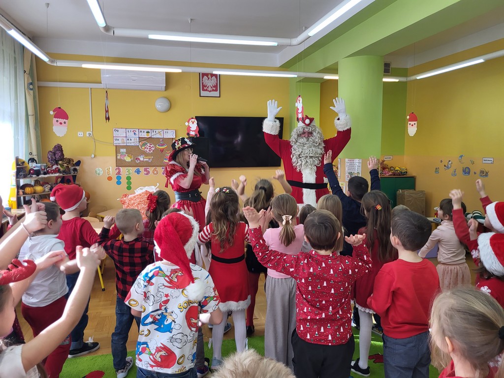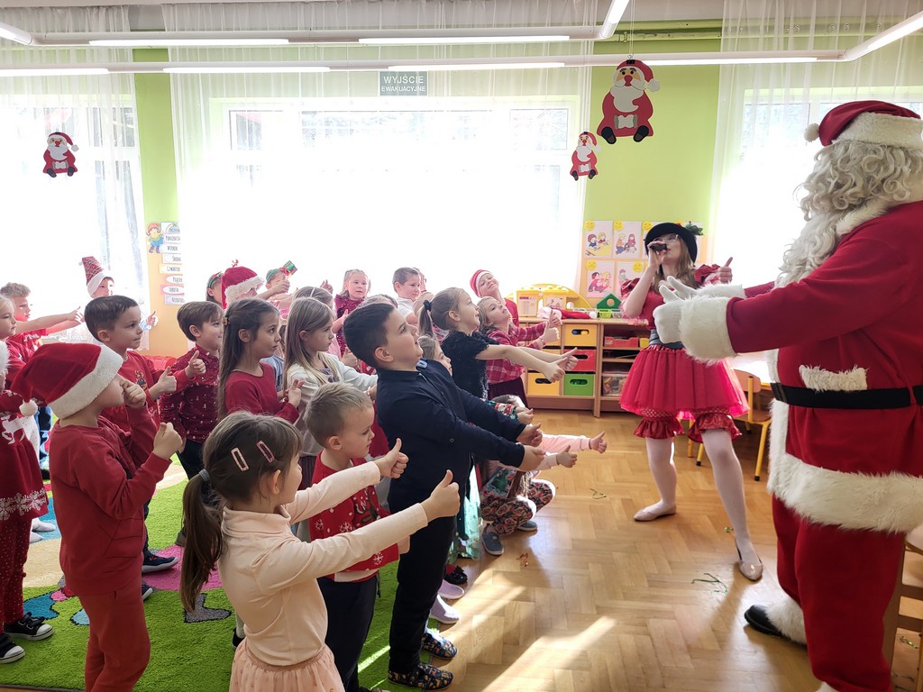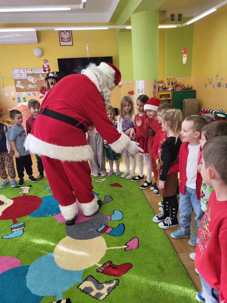 W poniedziałek, 1 grudnia, nasze przedszkole odwiedził wyjątkowy gość – Święty Mikołaj! Zanim pojawił się w salach, dzieci uczestniczyły w radosnej zabawie tanecznej prowadzonej przez panią Elf. Przedszkolaki tańczyły i bawiły się przy rytmach świątecznych utworów. Nie zabrakło zabaw z wykorzystaniem świątecznych rekwizytów: cukierków–grzechotek oraz małych tamburynków, które dodawały energii całej zabawie. Była też bitwa na śnieżki ze „śniegu” zrobionego z pianki poliuretanowej. Gdy do drzwi zapukał Mikołaj, na twarzach dzieci natychmiast zagościł zachwyt. Wspólnie z Mikołajem zatańczyliśmy przygotowany dla niego taniec. Każde dziecko otrzymało od niego piękny prezent, a na pamiątkę tego wyjątkowego spotkania zrobiło sobie z Mikołajem pamiątkowe zdjęcie. To był dzień pełen ciepła, uśmiechu i świątecznej atmosfery, który na długo pozostanie w pamięci naszych przedszkolaków.
