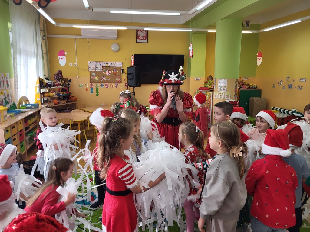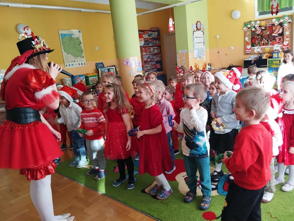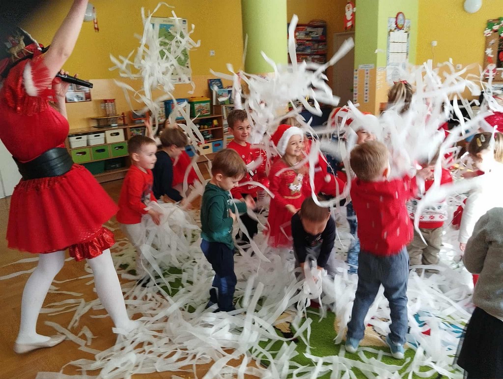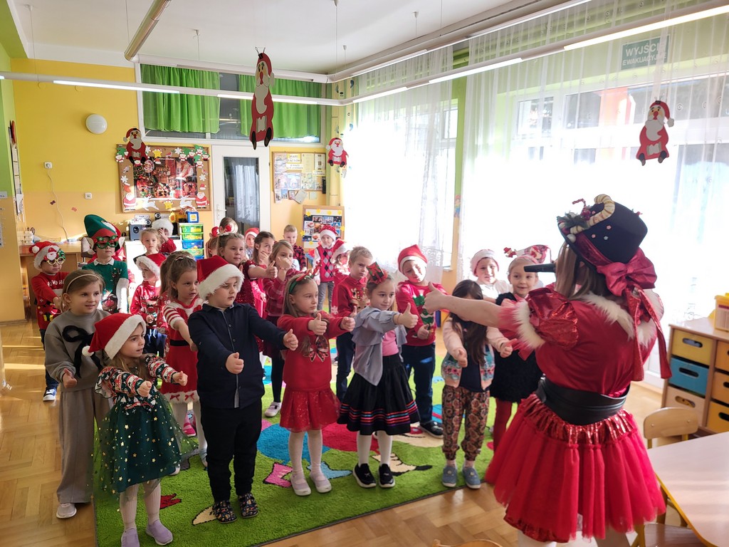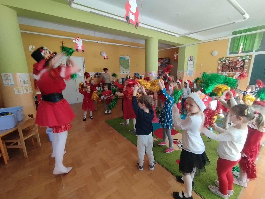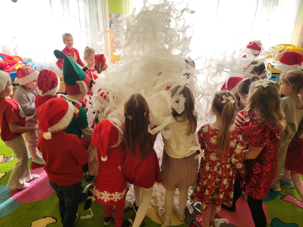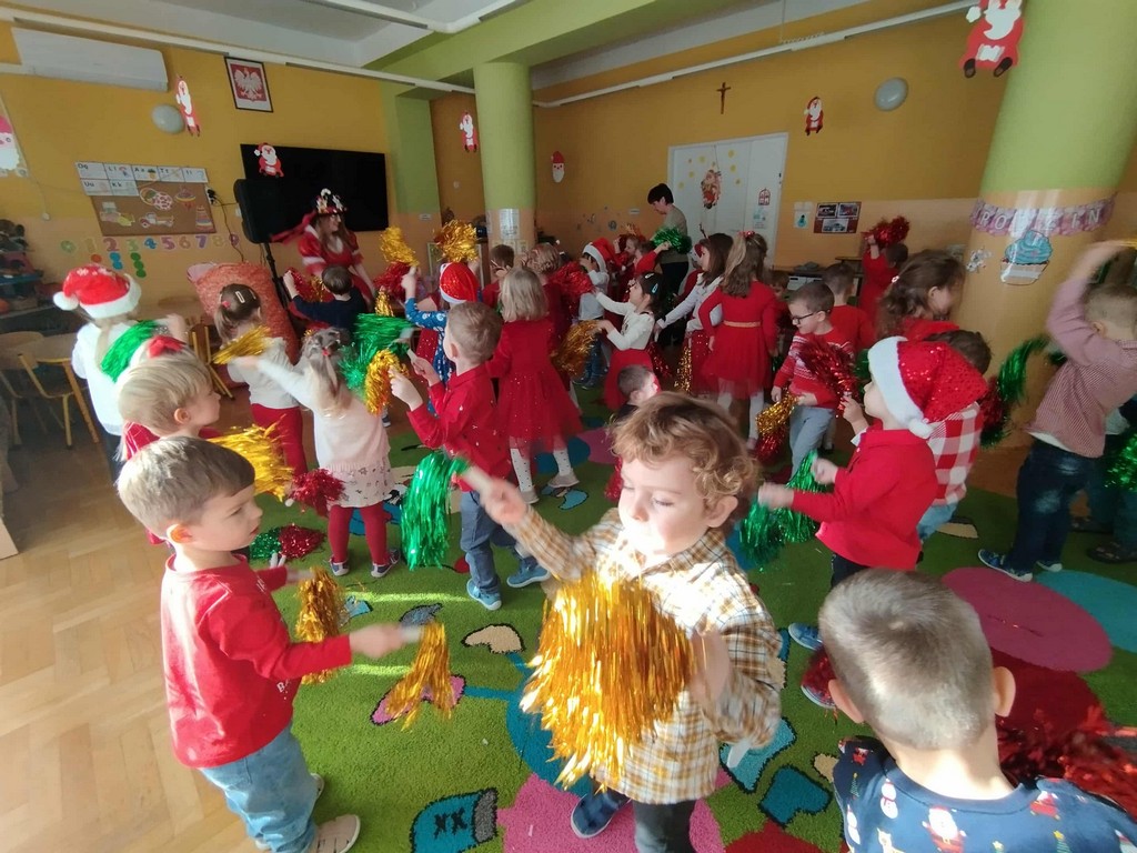 W poniedziałek, 1 grudnia, nasze przedszkole odwiedził wyjątkowy gość – Święty Mikołaj! Zanim pojawił się w salach, dzieci uczestniczyły w radosnej zabawie tanecznej prowadzonej przez panią Elf. Przedszkolaki tańczyły i bawiły się przy rytmach świątecznych utworów. Nie zabrakło zabaw z wykorzystaniem świątecznych rekwizytów: cukierków–grzechotek oraz małych tamburynków, które dodawały energii całej zabawie. Była też bitwa na śnieżki ze „śniegu” zrobionego z pianki poliuretanowej. Gdy do drzwi zapukał Mikołaj, na twarzach dzieci natychmiast zagościł zachwyt. Wspólnie z Mikołajem zatańczyliśmy przygotowany dla niego taniec. Każde dziecko otrzymało od niego piękny prezent, a na pamiątkę tego wyjątkowego spotkania zrobiło sobie z Mikołajem pamiątkowe zdjęcie. To był dzień pełen ciepła, uśmiechu i świątecznej atmosfery, który na długo pozostanie w pamięci naszych przedszkolaków.