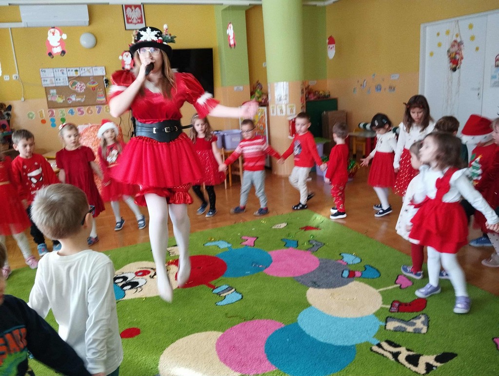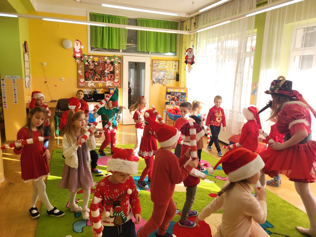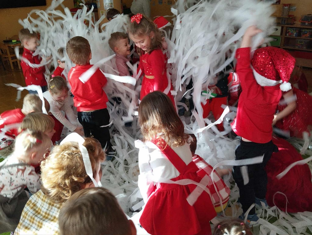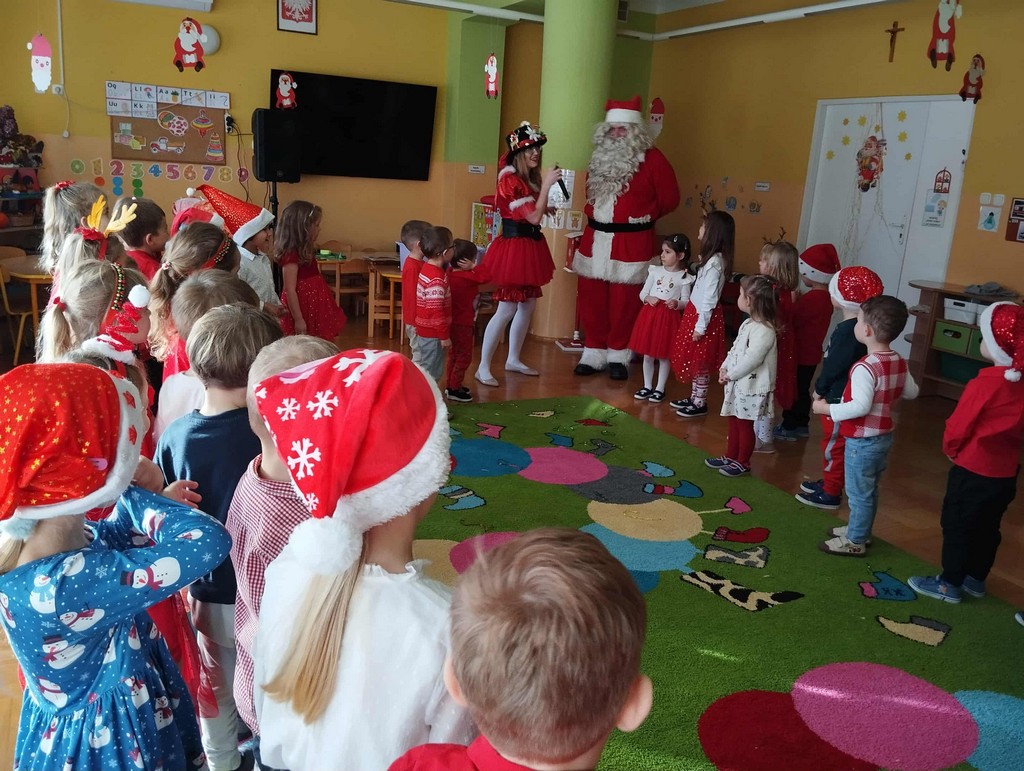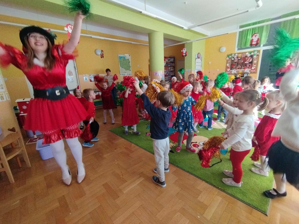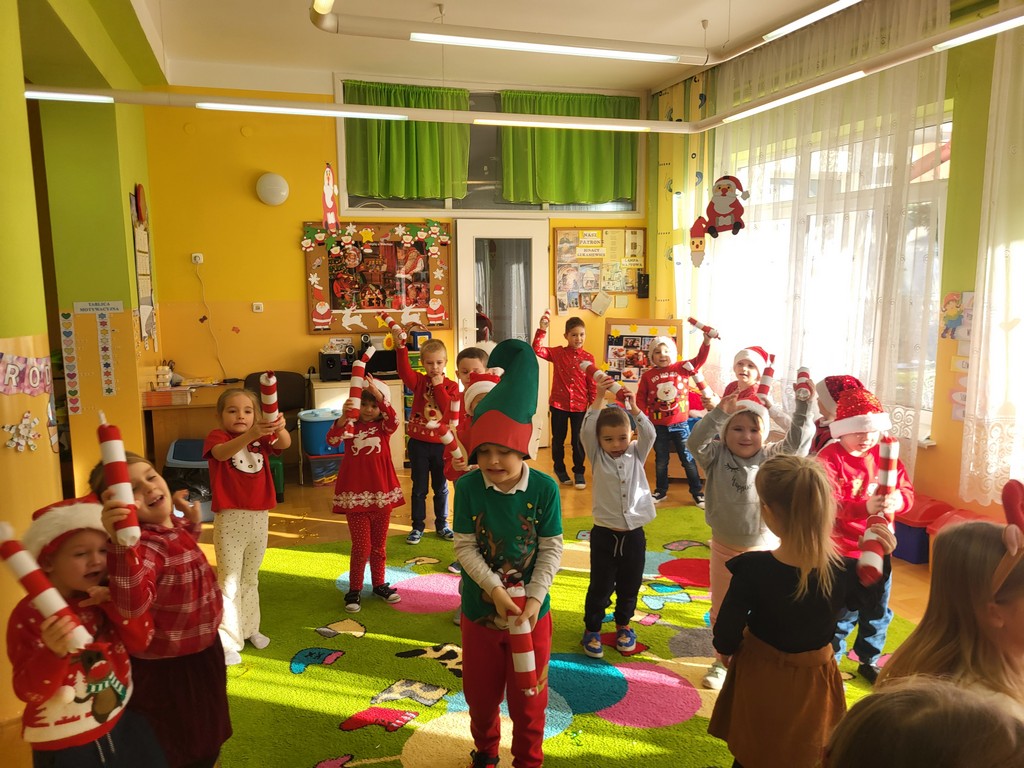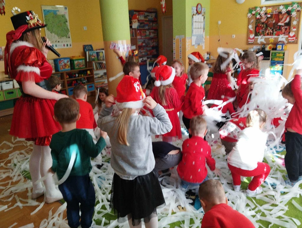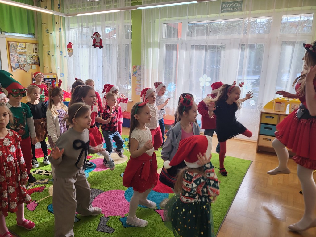 W poniedziałek, 1 grudnia, nasze przedszkole odwiedził wyjątkowy gość – Święty Mikołaj! Zanim pojawił się w salach, dzieci uczestniczyły w radosnej zabawie tanecznej prowadzonej przez panią Elf. Przedszkolaki tańczyły i bawiły się przy rytmach świątecznych utworów. Nie zabrakło zabaw z wykorzystaniem świątecznych rekwizytów: cukierków–grzechotek oraz małych tamburynków, które dodawały energii całej zabawie. Była też bitwa na śnieżki ze „śniegu” zrobionego z pianki poliuretanowej. Gdy do drzwi zapukał Mikołaj, na twarzach dzieci natychmiast zagościł zachwyt. Wspólnie z Mikołajem zatańczyliśmy przygotowany dla niego taniec. Każde dziecko otrzymało od niego piękny prezent, a na pamiątkę tego wyjątkowego spotkania zrobiło sobie z Mikołajem pamiątkowe zdjęcie. To był dzień pełen ciepła, uśmiechu i świątecznej atmosfery, który na długo pozostanie w pamięci naszych przedszkolaków.