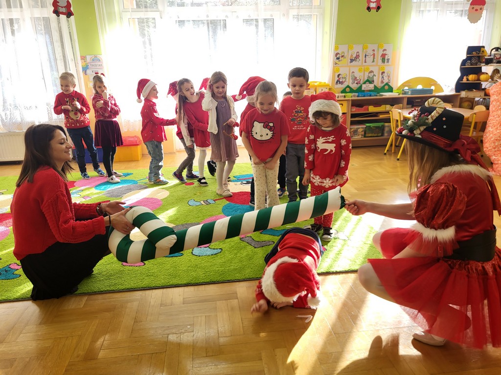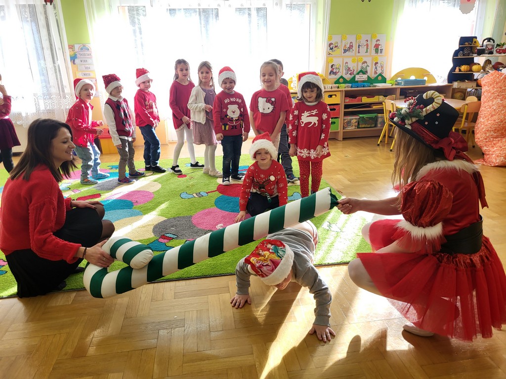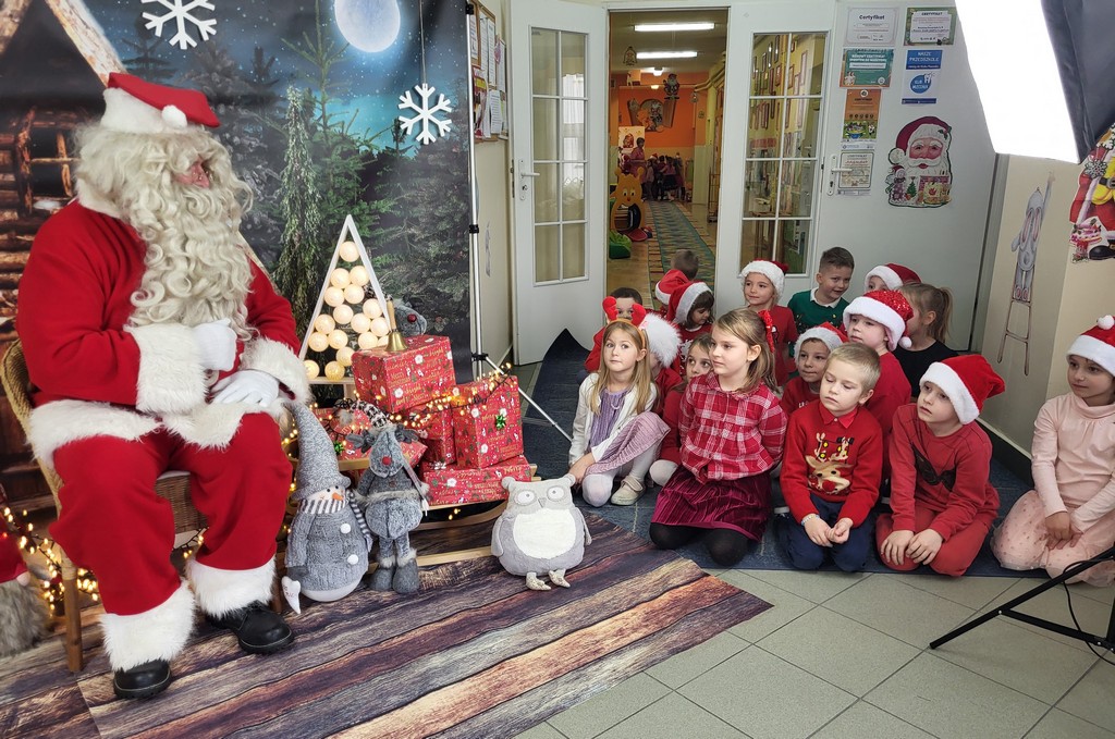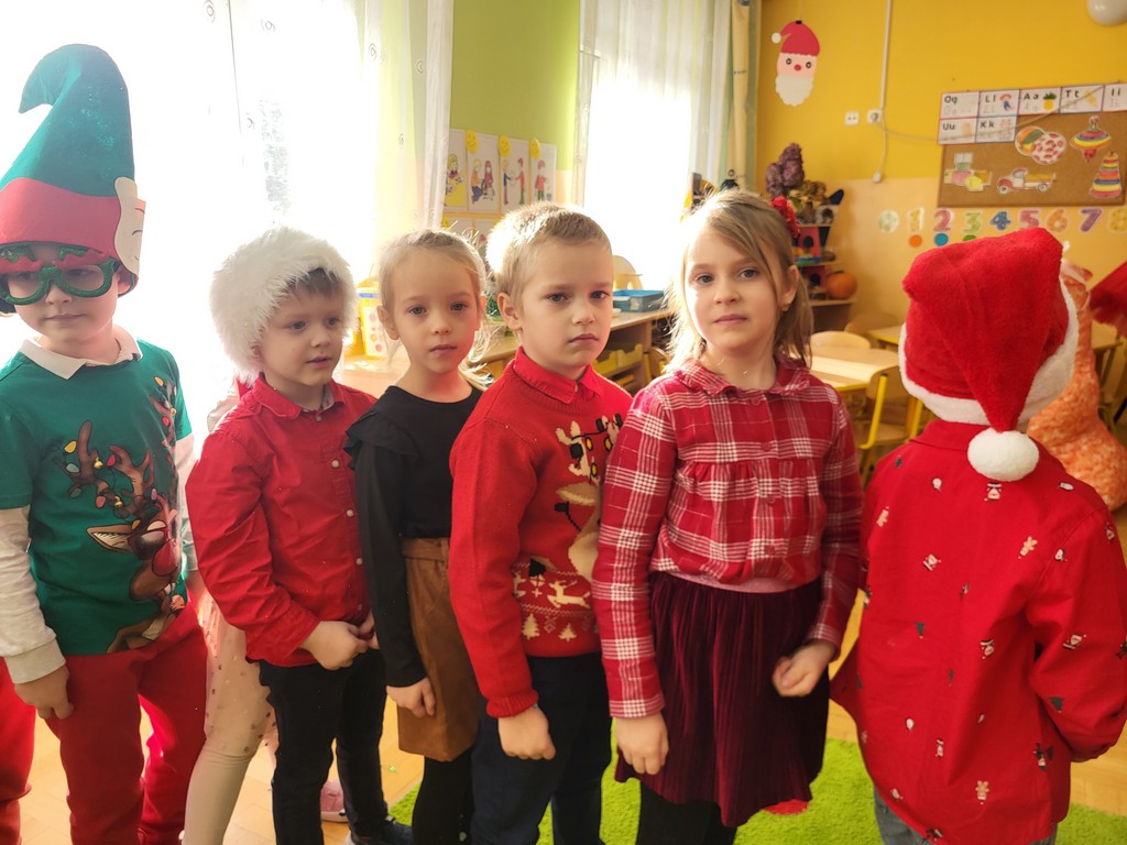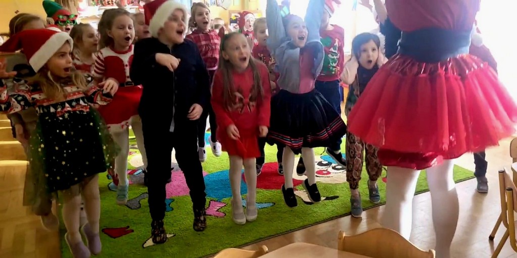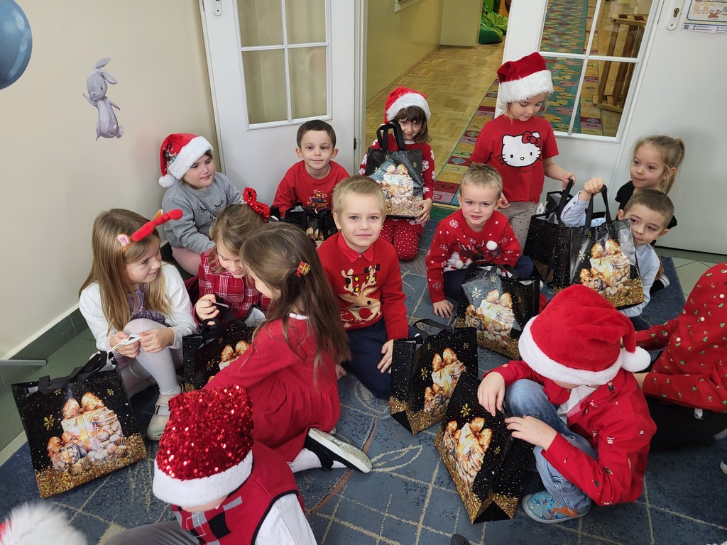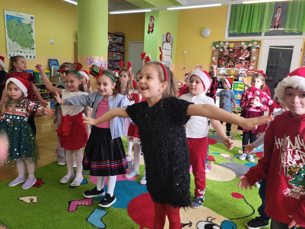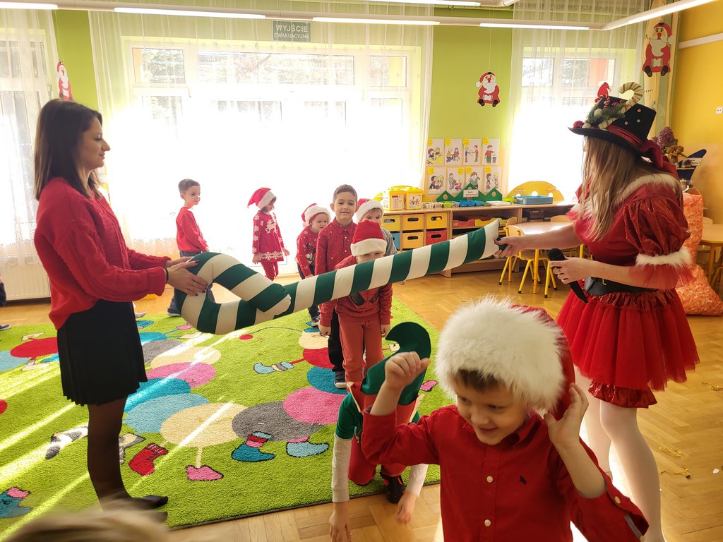 W poniedziałek, 1 grudnia, nasze przedszkole odwiedził wyjątkowy gość – Święty Mikołaj! Zanim pojawił się w salach, dzieci uczestniczyły w radosnej zabawie tanecznej prowadzonej przez panią Elf. Przedszkolaki tańczyły i bawiły się przy rytmach świątecznych utworów. Nie zabrakło zabaw z wykorzystaniem świątecznych rekwizytów: cukierków–grzechotek oraz małych tamburynków, które dodawały energii całej zabawie. Była też bitwa na śnieżki ze „śniegu” zrobionego z pianki poliuretanowej. Gdy do drzwi zapukał Mikołaj, na twarzach dzieci natychmiast zagościł zachwyt. Wspólnie z Mikołajem zatańczyliśmy przygotowany dla niego taniec. Każde dziecko otrzymało od niego piękny prezent, a na pamiątkę tego wyjątkowego spotkania zrobiło sobie z Mikołajem pamiątkowe zdjęcie. To był dzień pełen ciepła, uśmiechu i świątecznej atmosfery, który na długo pozostanie w pamięci naszych przedszkolaków.