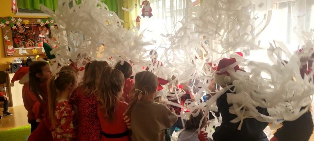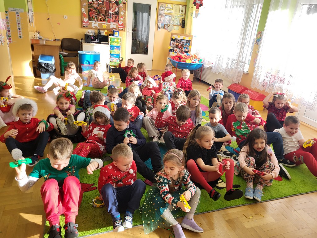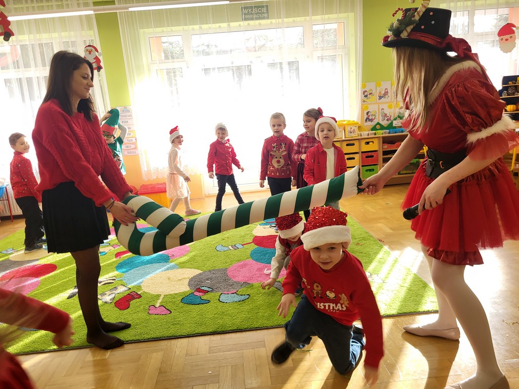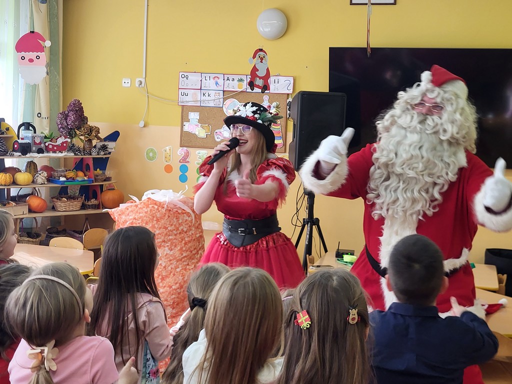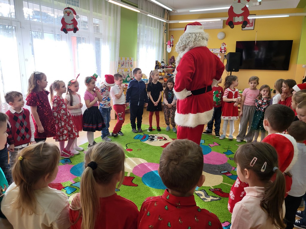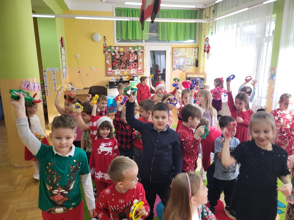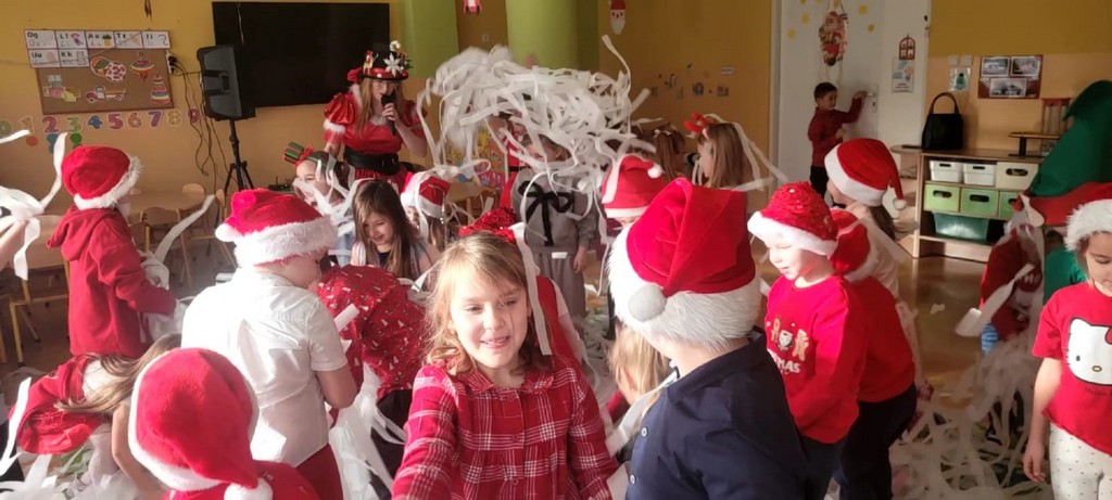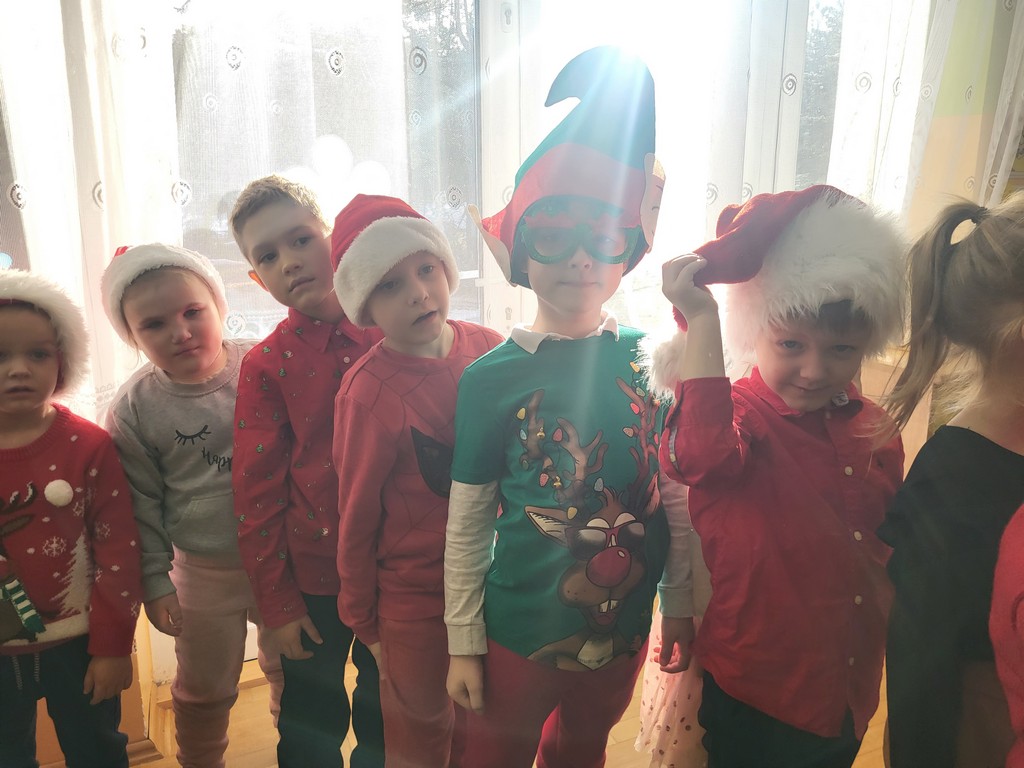 W poniedziałek, 1 grudnia, nasze przedszkole odwiedził wyjątkowy gość – Święty Mikołaj! Zanim pojawił się w salach, dzieci uczestniczyły w radosnej zabawie tanecznej prowadzonej przez panią Elf. Przedszkolaki tańczyły i bawiły się przy rytmach świątecznych utworów. Nie zabrakło zabaw z wykorzystaniem świątecznych rekwizytów: cukierków–grzechotek oraz małych tamburynków, które dodawały energii całej zabawie. Była też bitwa na śnieżki ze „śniegu” zrobionego z pianki poliuretanowej. Gdy do drzwi zapukał Mikołaj, na twarzach dzieci natychmiast zagościł zachwyt. Wspólnie z Mikołajem zatańczyliśmy przygotowany dla niego taniec. Każde dziecko otrzymało od niego piękny prezent, a na pamiątkę tego wyjątkowego spotkania zrobiło sobie z Mikołajem pamiątkowe zdjęcie. To był dzień pełen ciepła, uśmiechu i świątecznej atmosfery, który na długo pozostanie w pamięci naszych przedszkolaków.