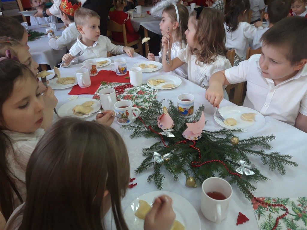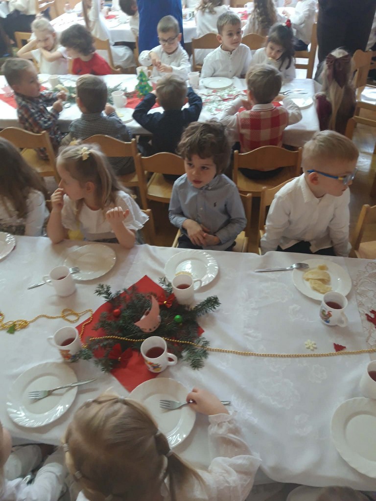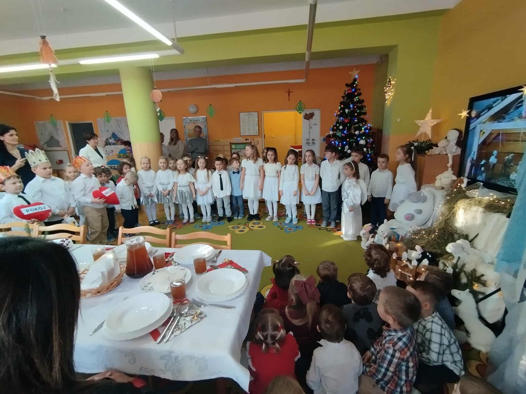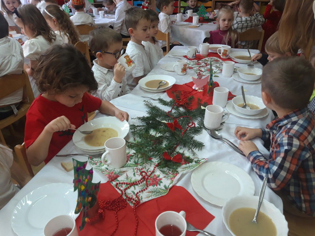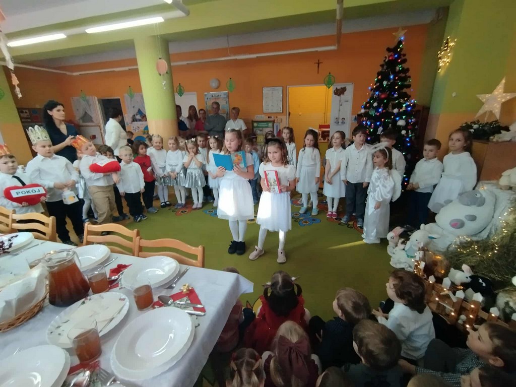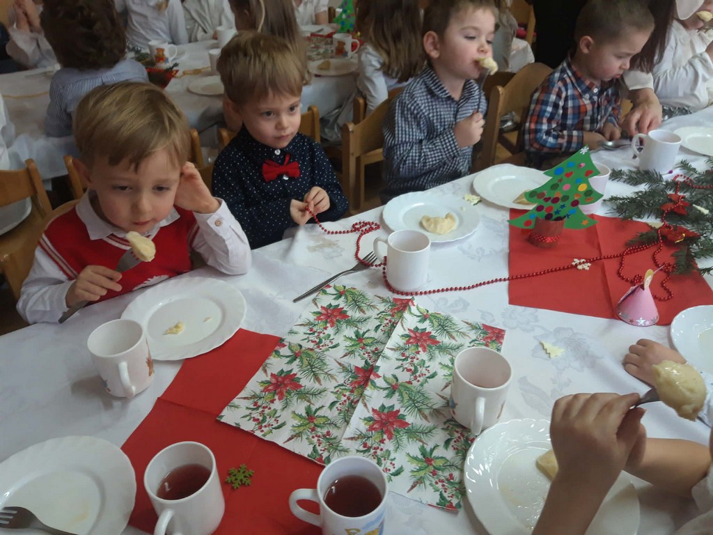 Od samego rana w całym przedszkolu unosił się zapach świątecznych potraw oraz aromat choinek, a odświętnie ubrane dzieci z niecierpliwością oczekiwały rozpoczęcia uroczystości. Przedszkolaki przygotowały i zaprezentowały okolicznościowy montaż słowno – muzyczny, który wszystkich zachwycił. Po części artystycznej nastąpił moment dzielenia się opłatkiem i wzajemnych życzeń. Następnie wraz z zaproszonymi gośćmi; Panem Dyrektorem, Radą Rodziców oraz personelem przedszkola usiedliśmy do wigilijnego obiadu. Atmosfera miłości i spokoju wprowadziła wszystkich