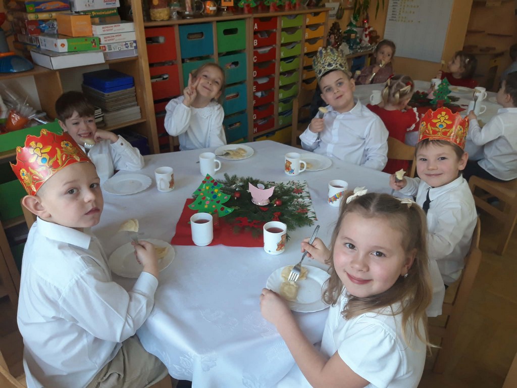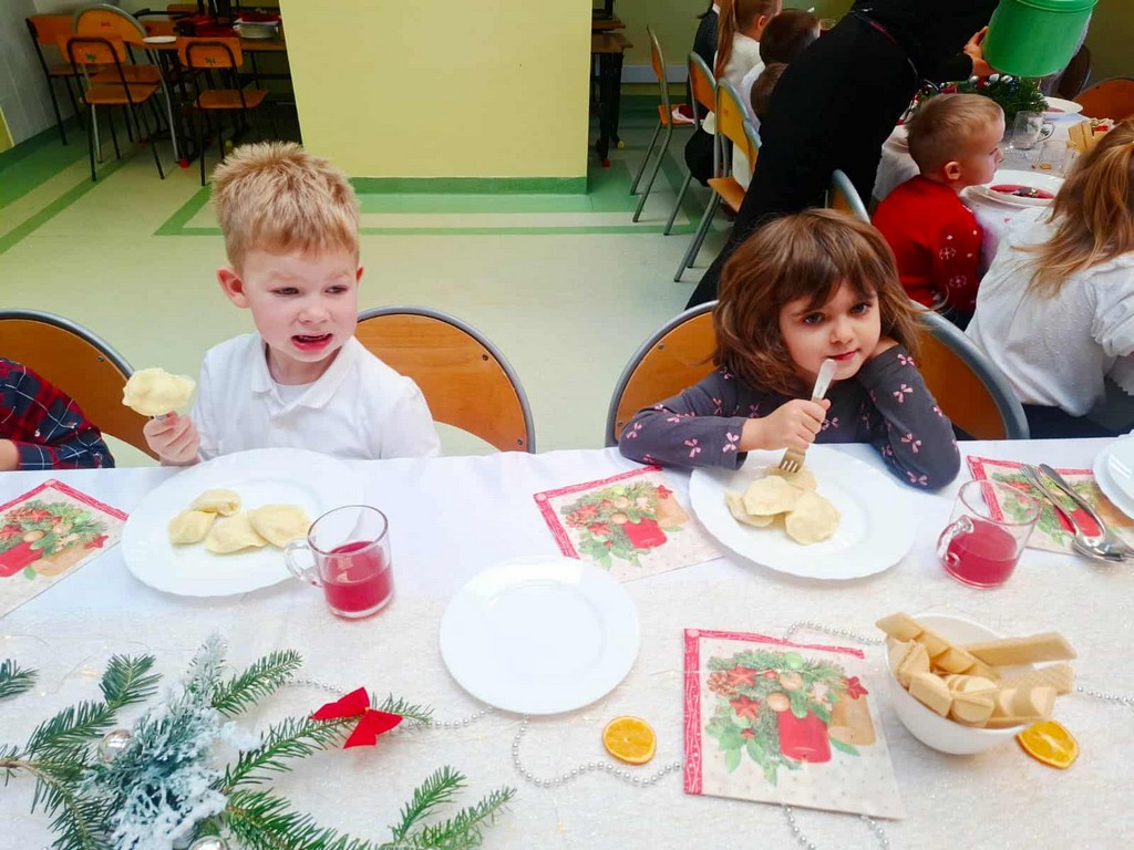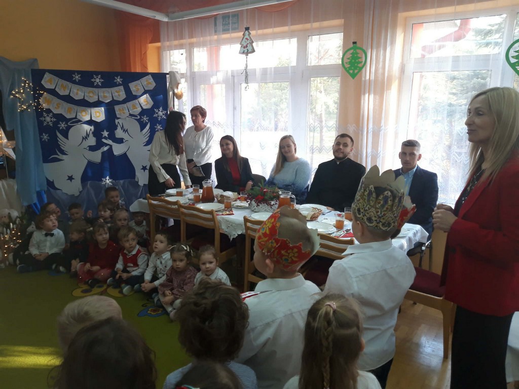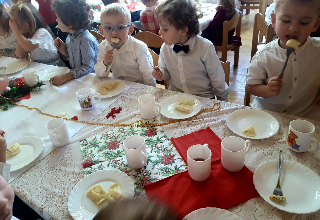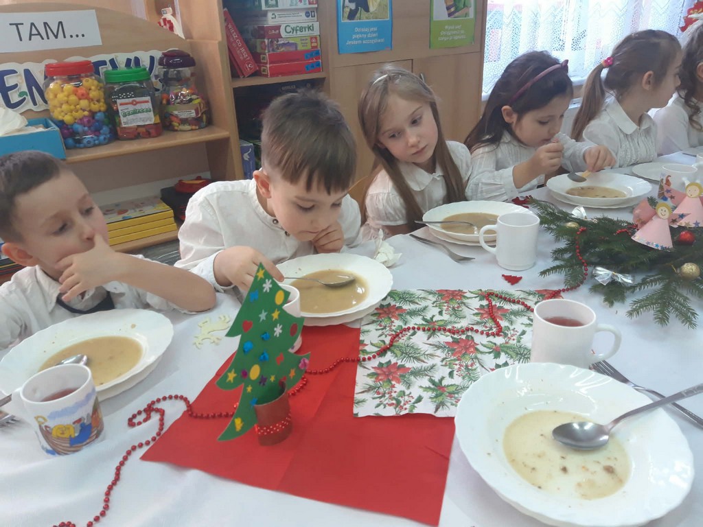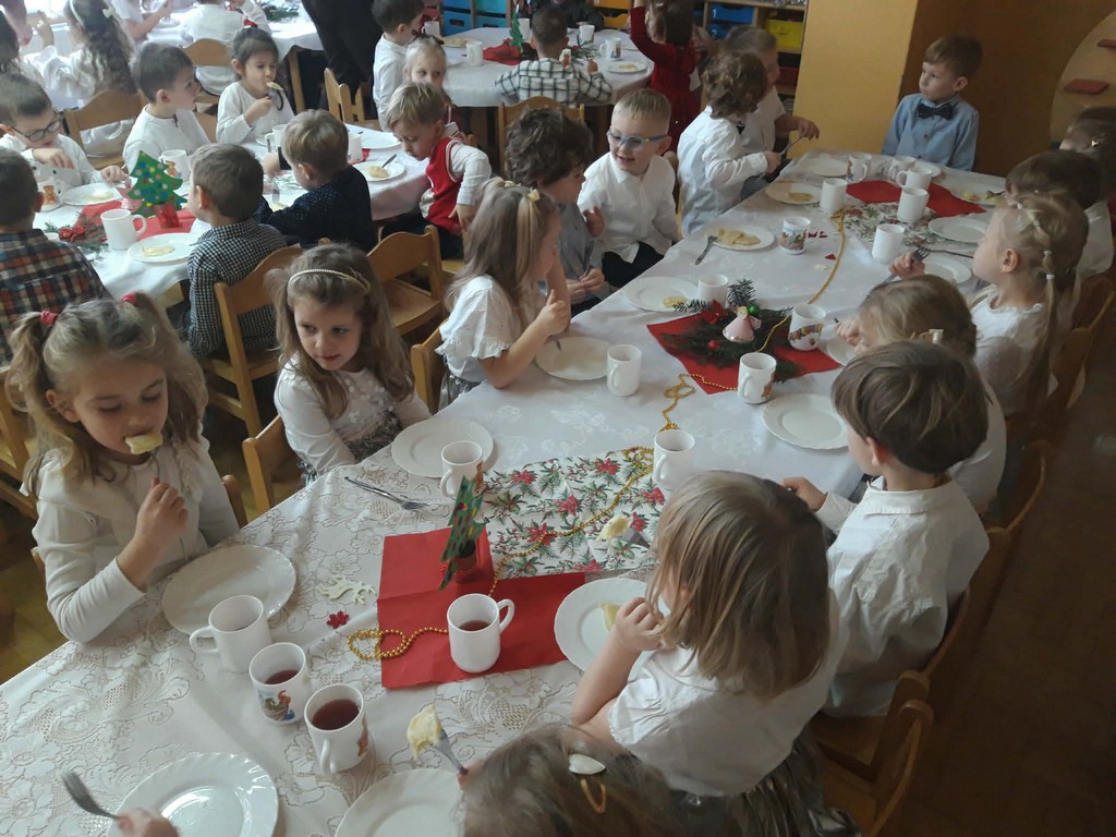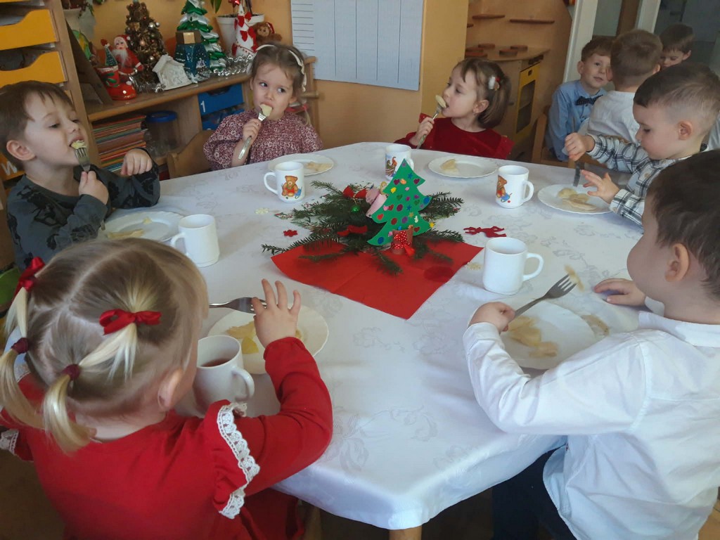 Od samego rana w całym przedszkolu unosił się zapach świątecznych potraw oraz aromat choinek, a odświętnie ubrane dzieci z niecierpliwością oczekiwały rozpoczęcia uroczystości. Przedszkolaki przygotowały i zaprezentowały okolicznościowy montaż słowno – muzyczny, który wszystkich zachwycił. Po części artystycznej nastąpił moment dzielenia się opłatkiem i wzajemnych życzeń. Następnie wraz z zaproszonymi gośćmi; Panem Dyrektorem, Radą Rodziców oraz personelem przedszkola usiedliśmy do wigilijnego obiadu. Atmosfera miłości i spokoju wprowadziła wszystkich
