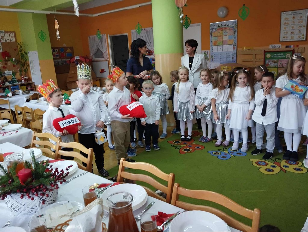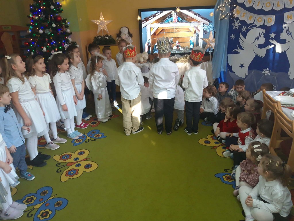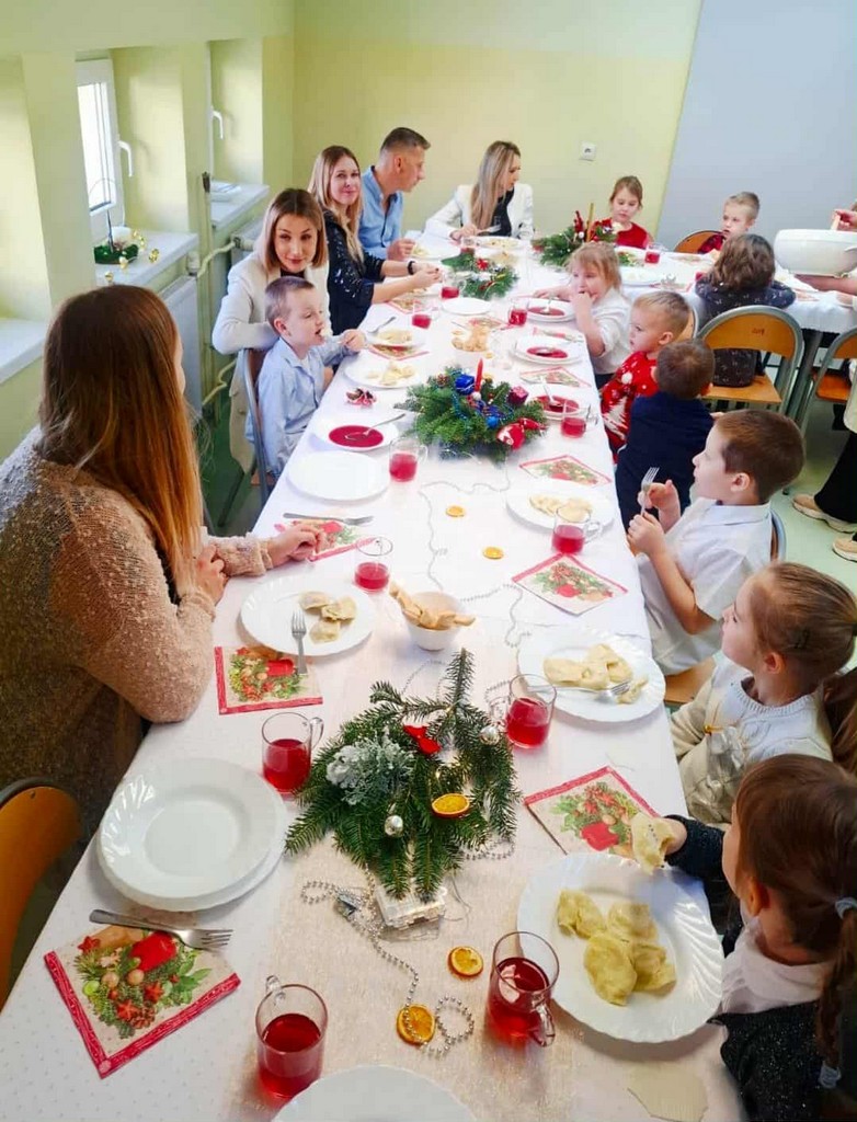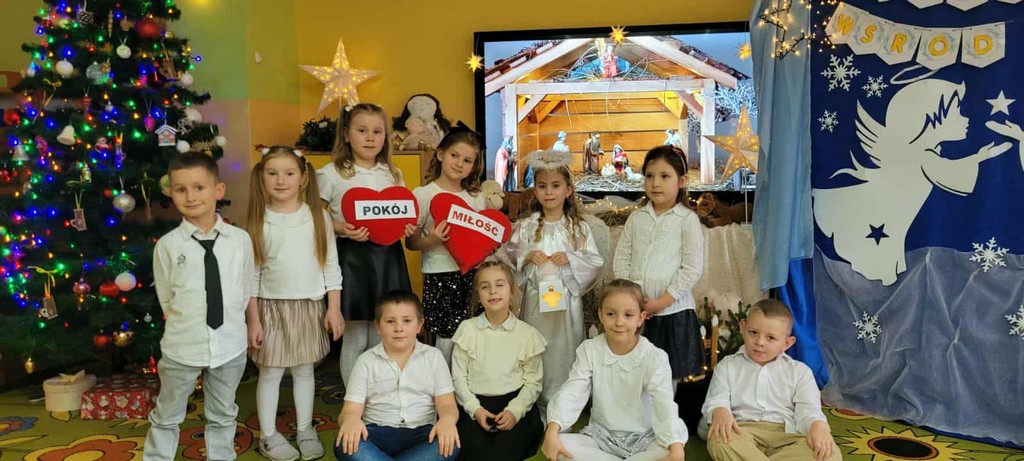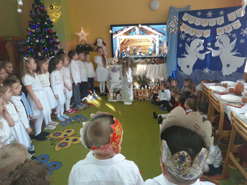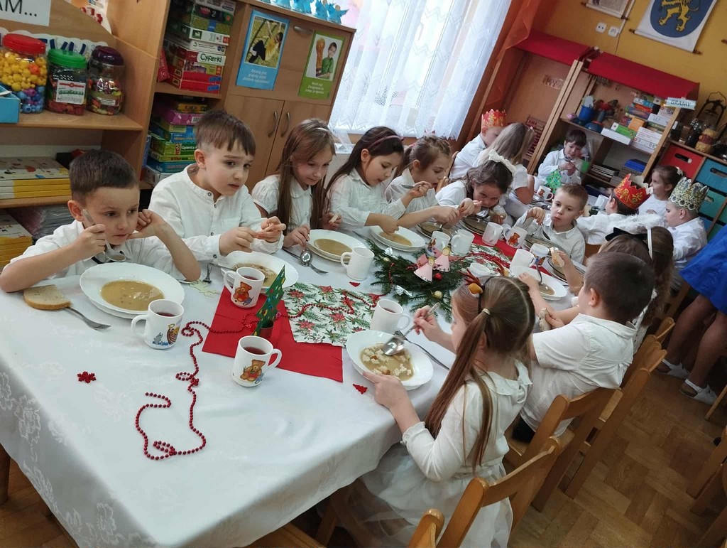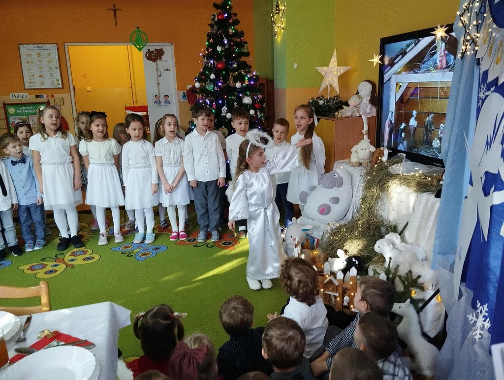 Od samego rana w całym przedszkolu unosił się zapach świątecznych potraw oraz aromat choinek, a odświętnie ubrane dzieci z niecierpliwością oczekiwały rozpoczęcia uroczystości. Przedszkolaki przygotowały i zaprezentowały okolicznościowy montaż słowno – muzyczny, który wszystkich zachwycił. Po części artystycznej nastąpił moment dzielenia się opłatkiem i wzajemnych życzeń. Następnie wraz z zaproszonymi gośćmi; Panem Dyrektorem, Radą Rodziców oraz personelem przedszkola usiedliśmy do wigilijnego obiadu. Atmosfera miłości i spokoju wprowadziła wszystkich