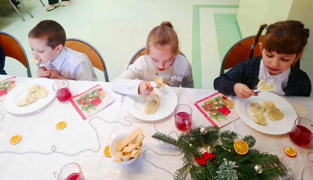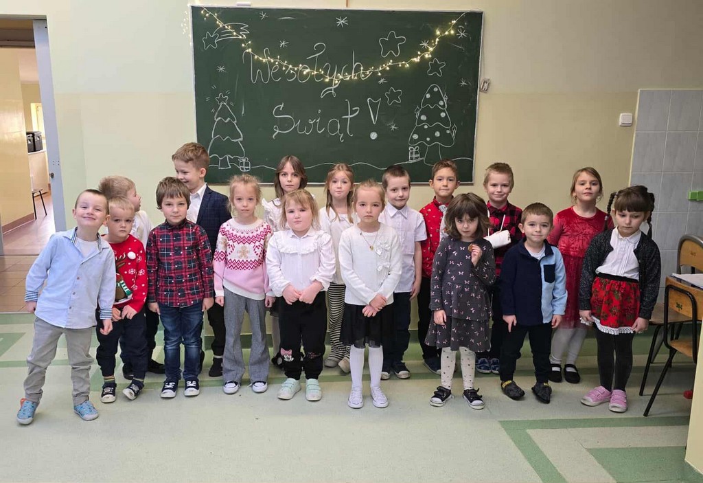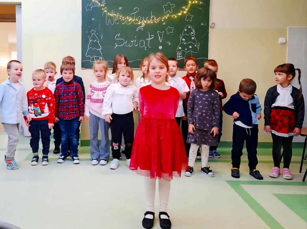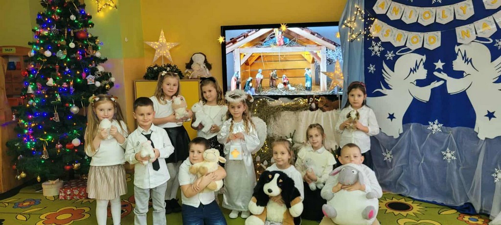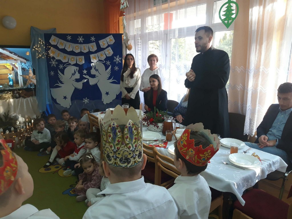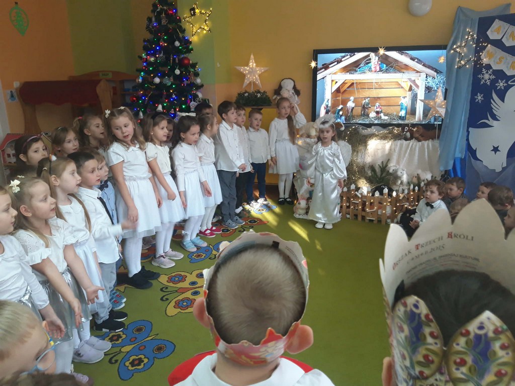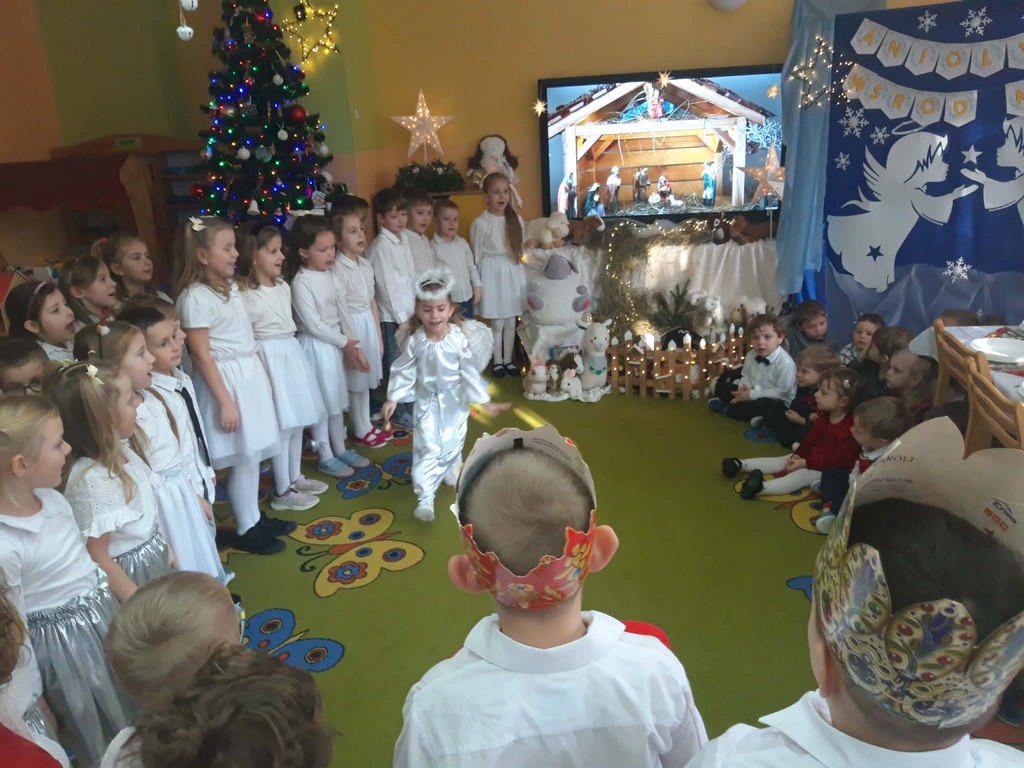 Od samego rana w całym przedszkolu unosił się zapach świątecznych potraw oraz aromat choinek, a odświętnie ubrane dzieci z niecierpliwością oczekiwały rozpoczęcia uroczystości. Przedszkolaki przygotowały i zaprezentowały okolicznościowy montaż słowno – muzyczny, który wszystkich zachwycił. Po części artystycznej nastąpił moment dzielenia się opłatkiem i wzajemnych życzeń. Następnie wraz z zaproszonymi gośćmi; Panem Dyrektorem, Radą Rodziców oraz personelem przedszkola usiedliśmy do wigilijnego obiadu. Atmosfera miłości i spokoju wprowadziła wszystkich